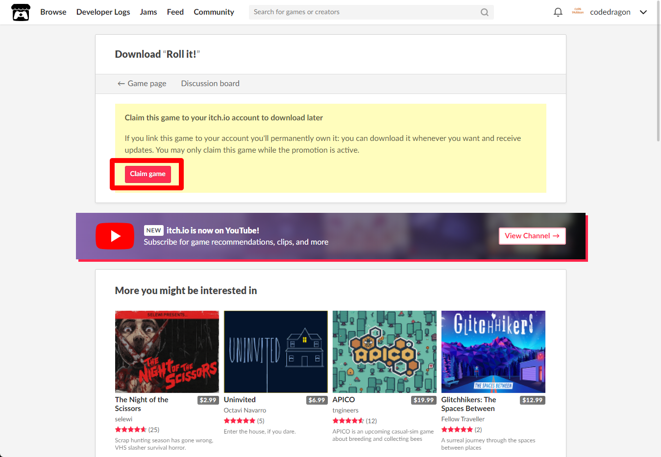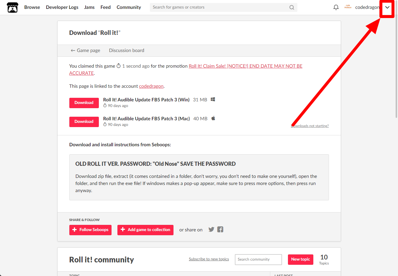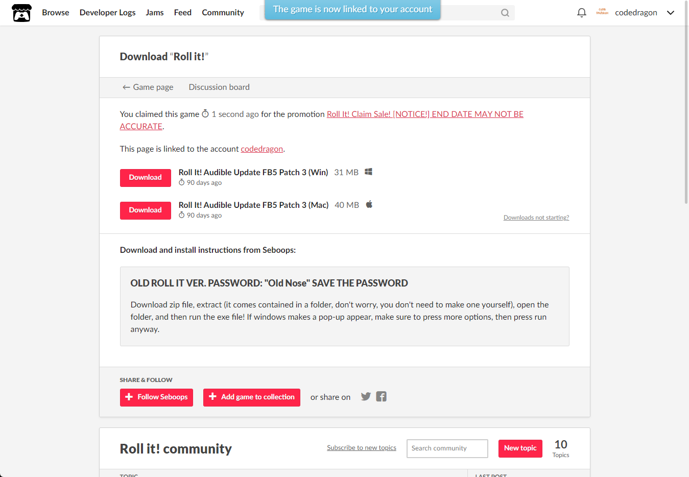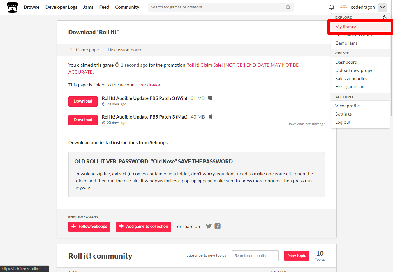 [Claim game]을 클릭하면 "Roll it!" 게임이 나의 게임 라이브러리에 추가되고 설치파일을 다운받을 수 있는 페이지로 이동됩니다.