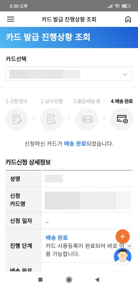 카드 발급 상태는 "배송 완료"로 변경되었습니다.