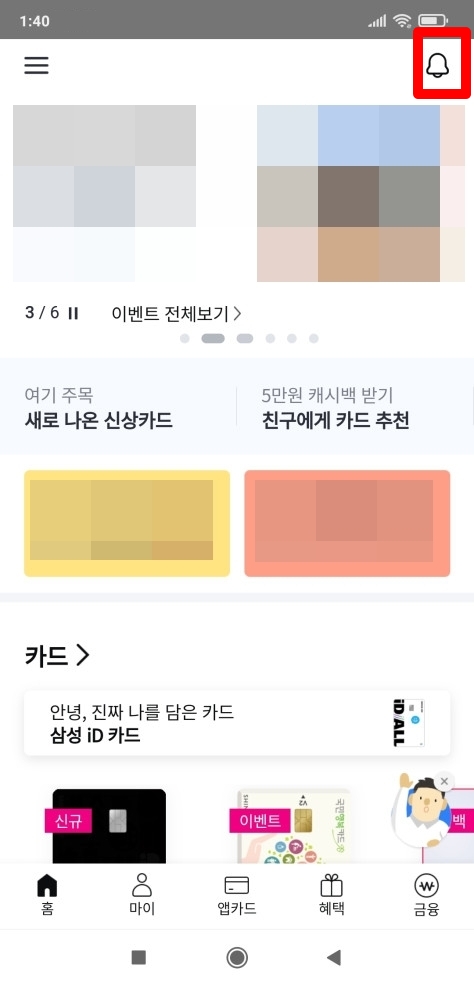 삼성카드 앱 실행 후 우측 상단의 종모양의 [알림] 아이콘을 클릭합니다.