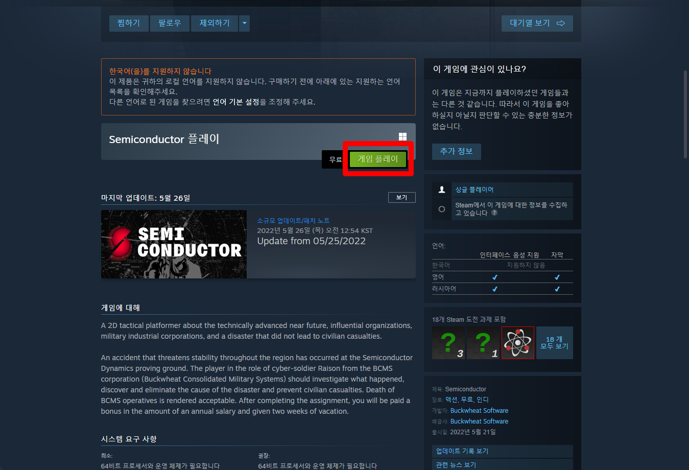 "Semiconductor" 페이지를 내려 [게임 플레이]를 클릭하면 됩니다.