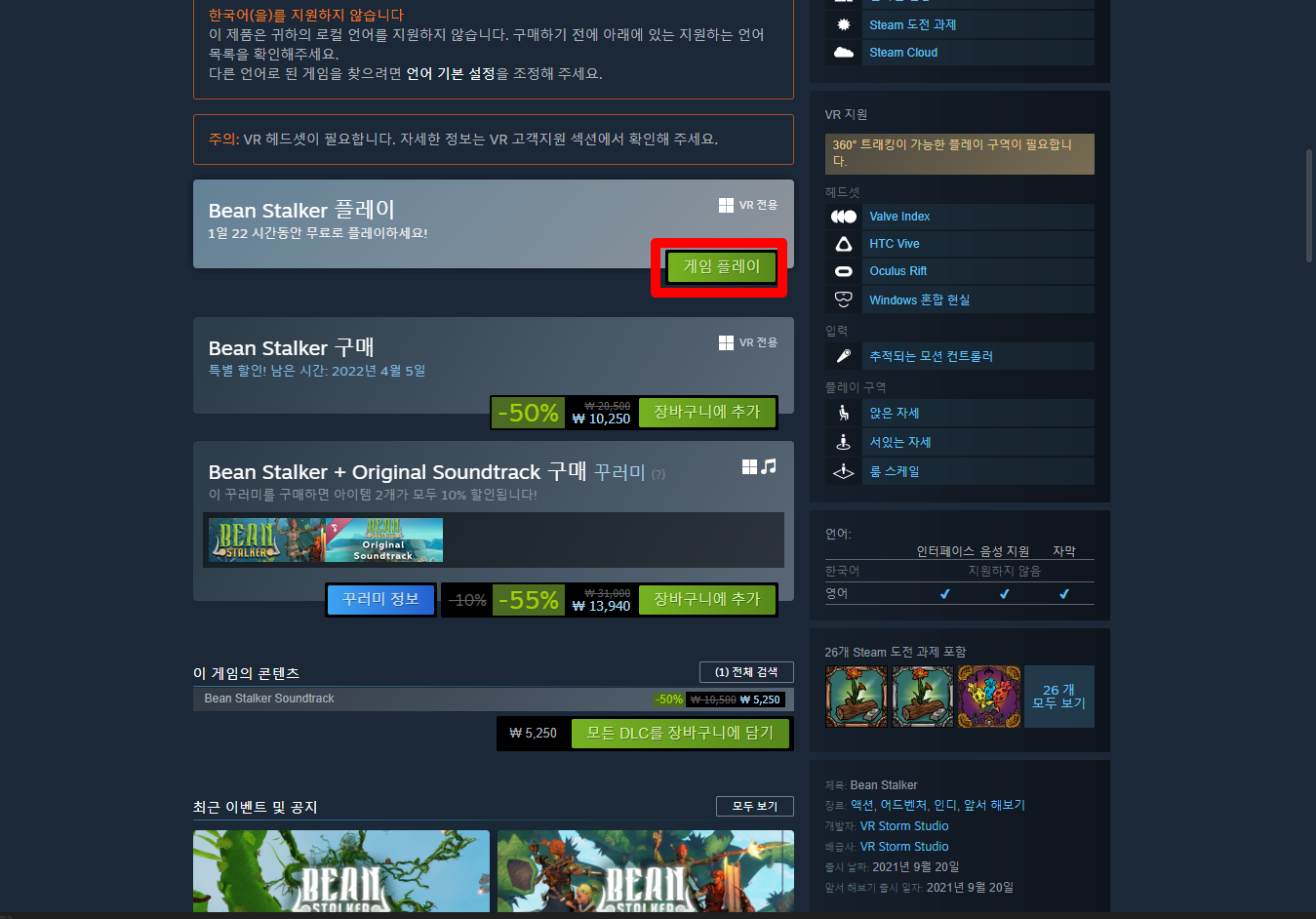 금주 게임은 "VR" 게임인 "Bean Stalker" 입니다