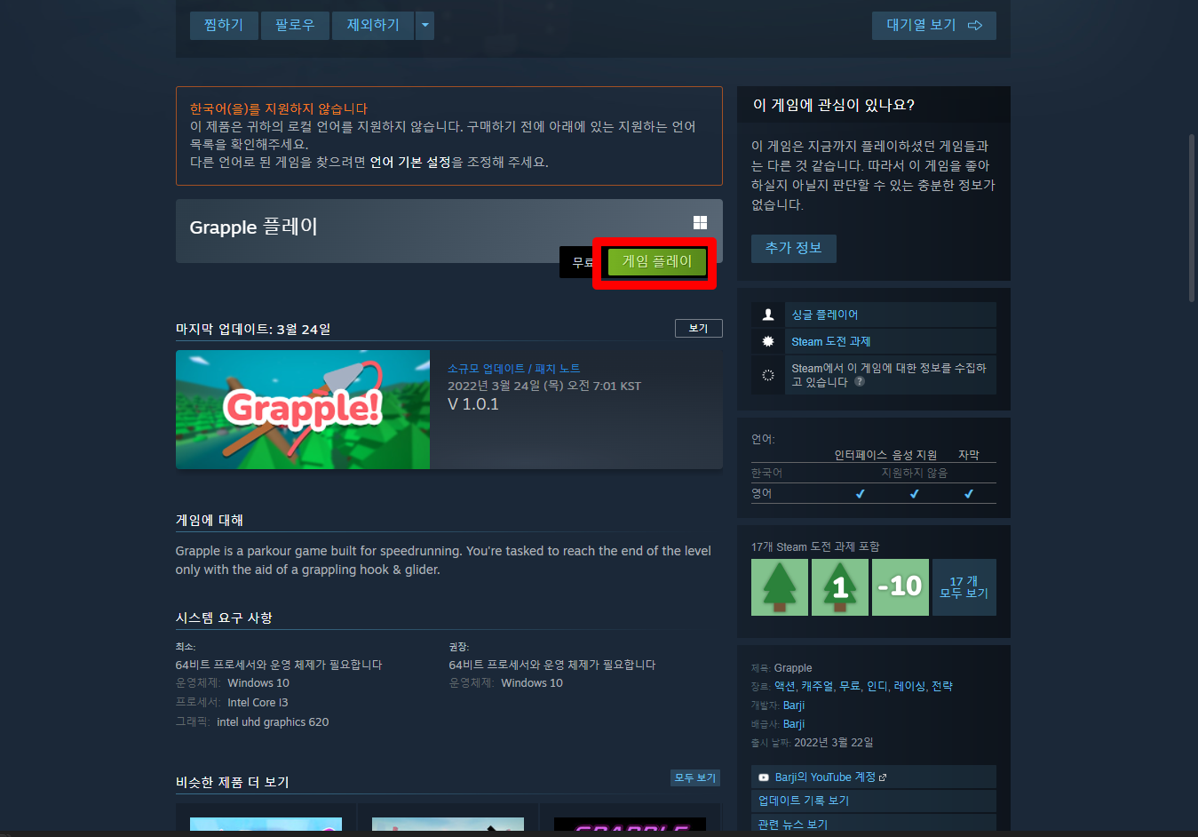 "Grapple" 페이지를 내려 [게임 플레이]를 클릭하면 됩니다.