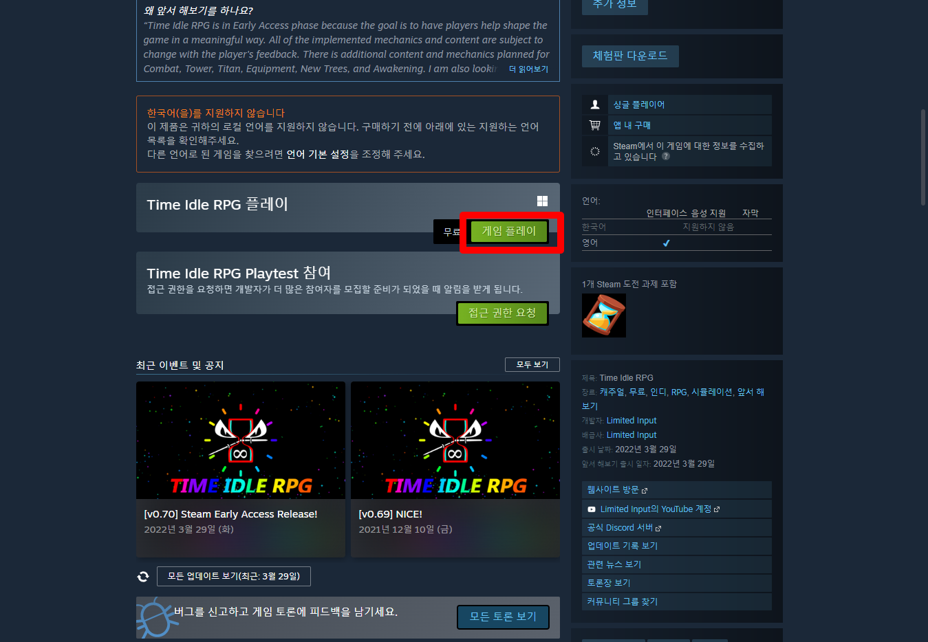 "Time Idle RPG" 페이지를 내려 [게임 플레이]를 클릭하면 됩니다.