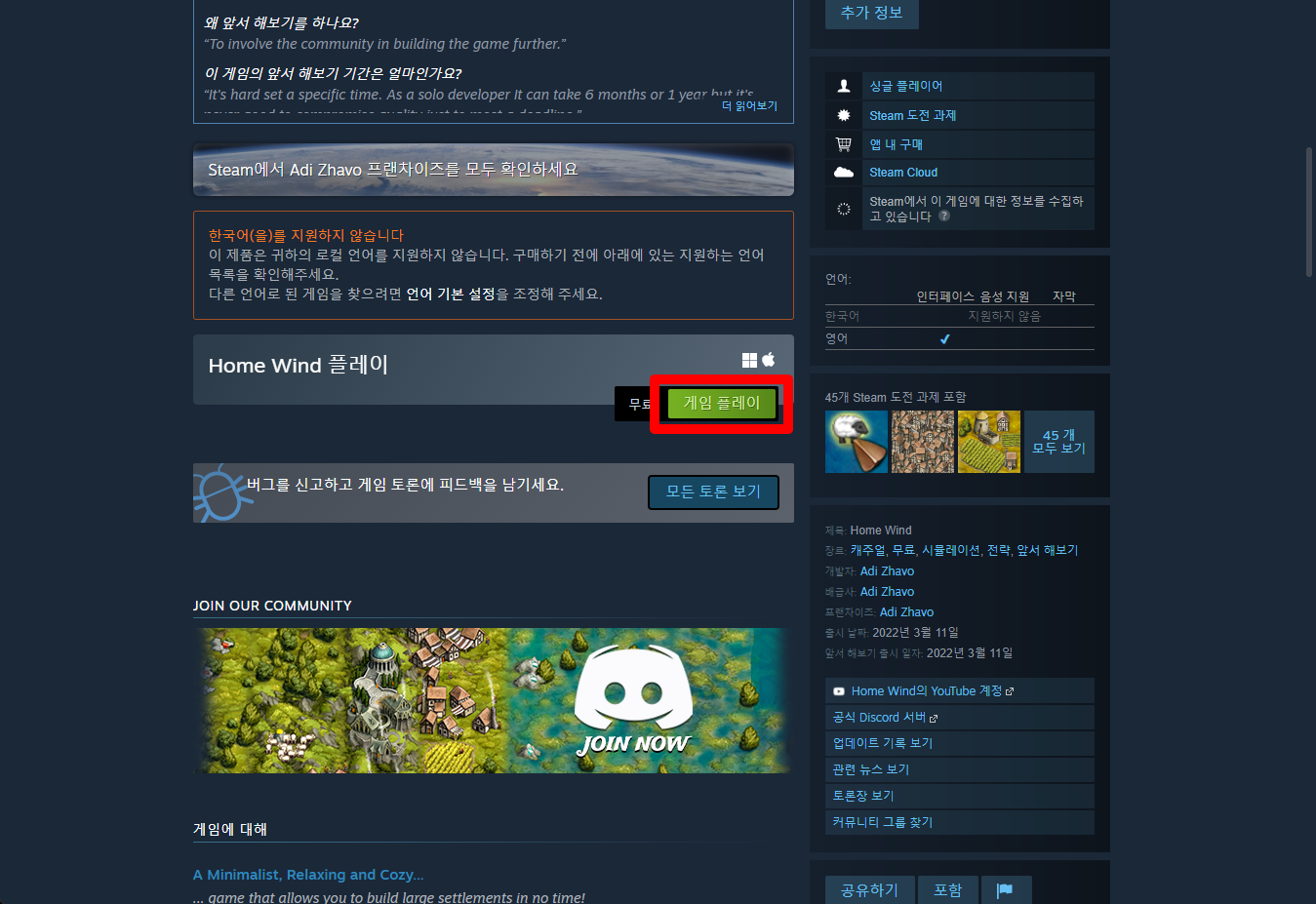 "Home Wind" 페이지를 내려 [게임 플레이]를 클릭하면 됩니다.