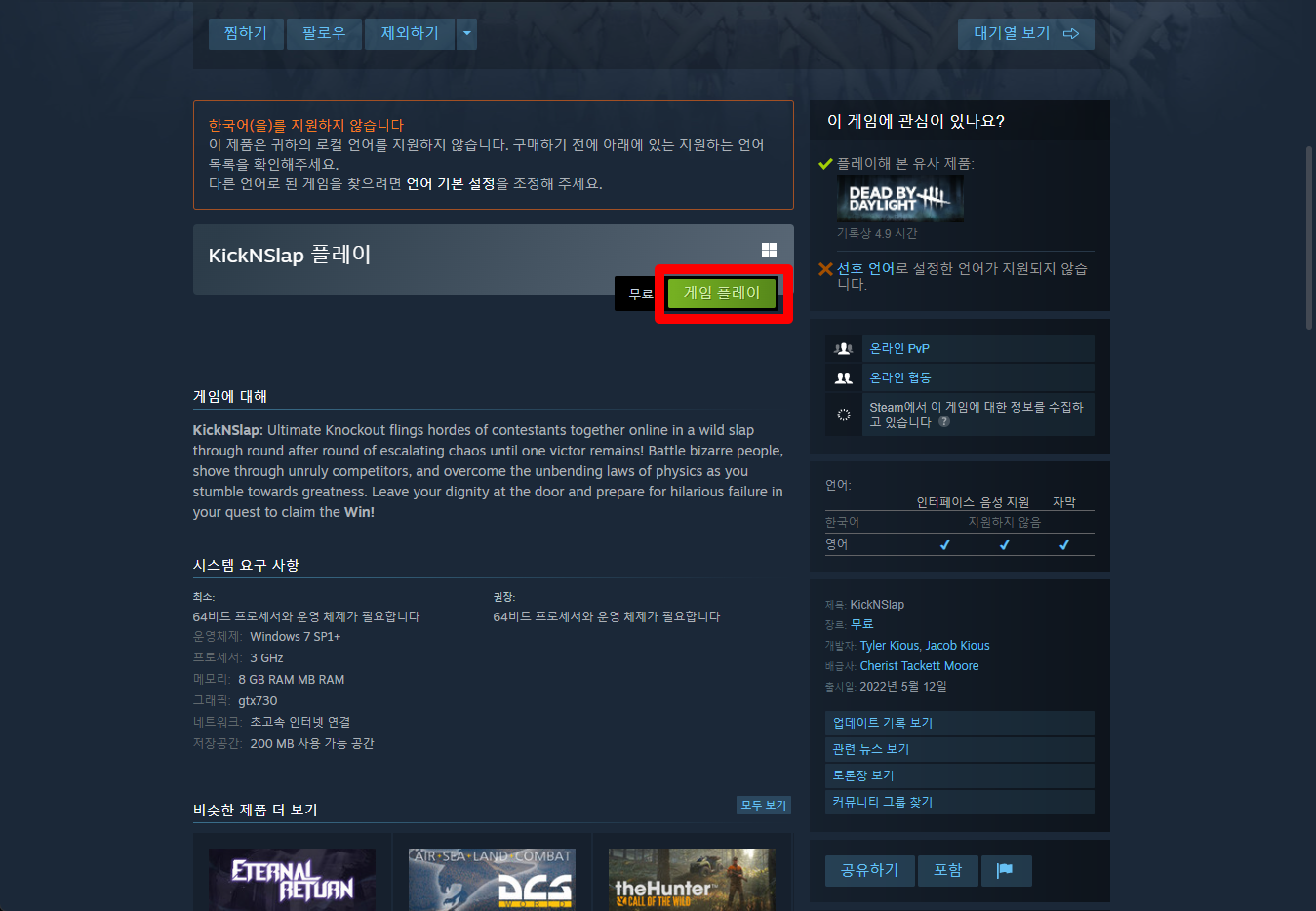 "KickNSlap" 페이지를 내려 [게임 플레이]를 클릭하면 됩니다.
