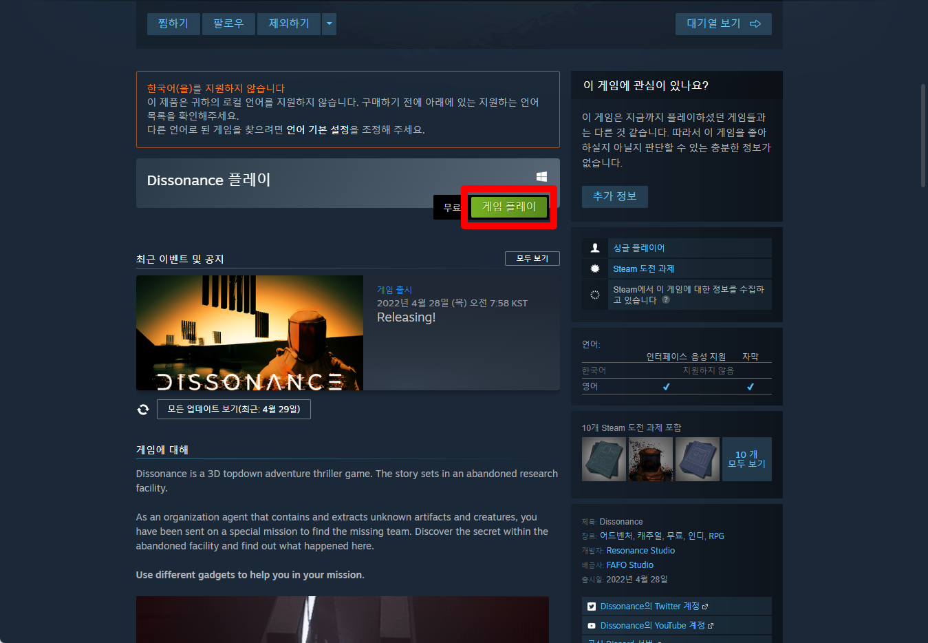"Dissonance" 페이지를 내려 [게임 플레이]를 클릭하면 됩니다.