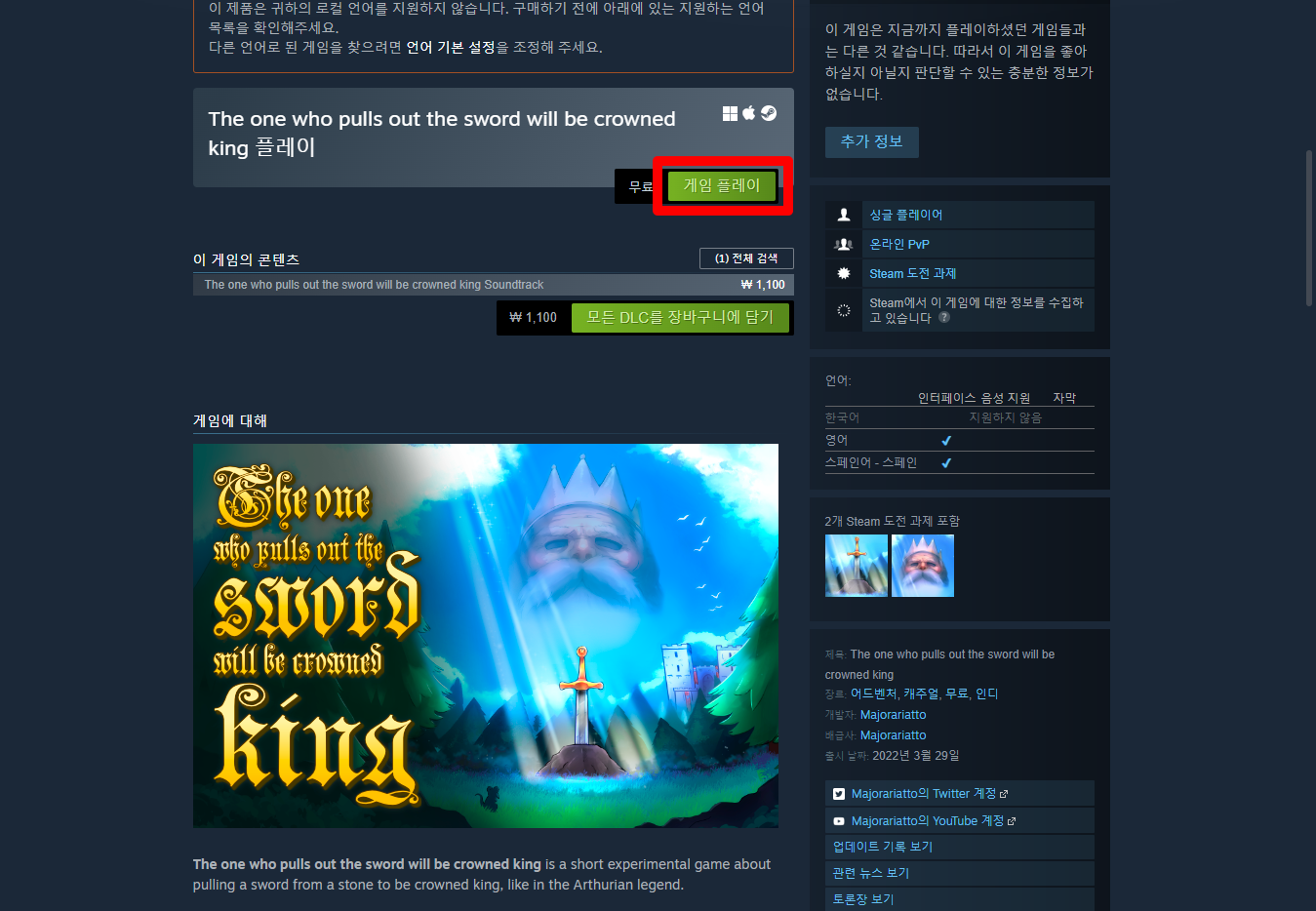"The one who pulls out the sword will be crowned king" 스팀 페이지 입니다.