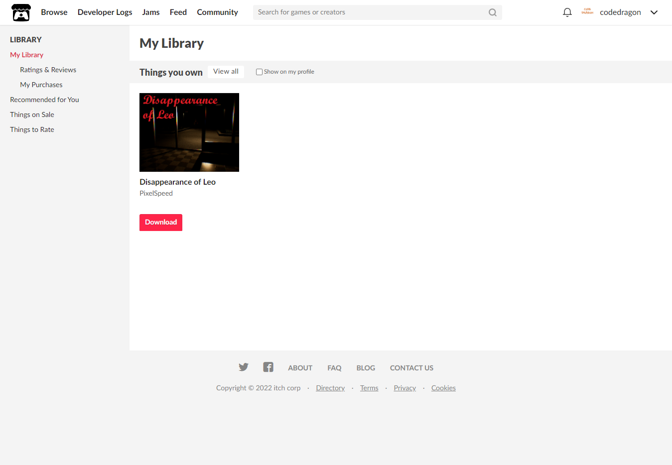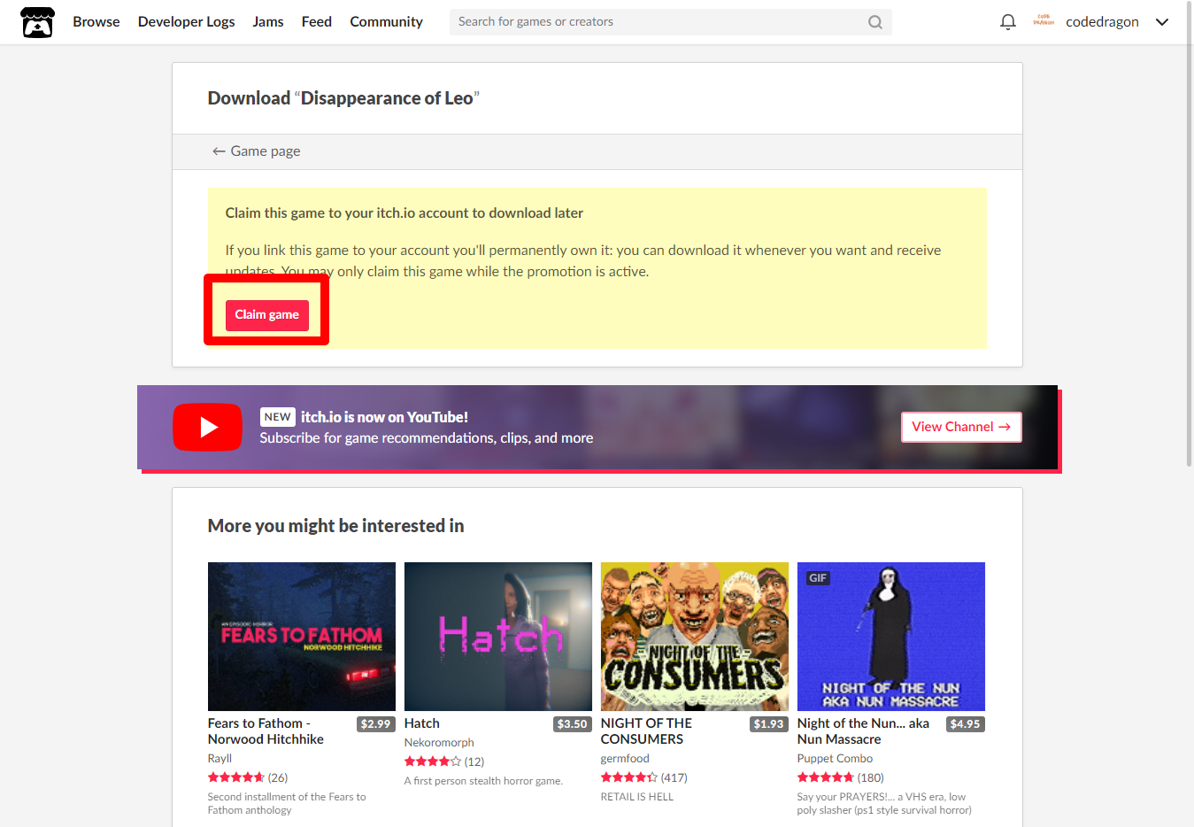 [Claim game]을 클릭하면 "Disappearance of Leo" 게임이 나의 게임 라이브러리에 추가되고 설치파일을 다운받을 수 있는 페이지로 이동됩니다.