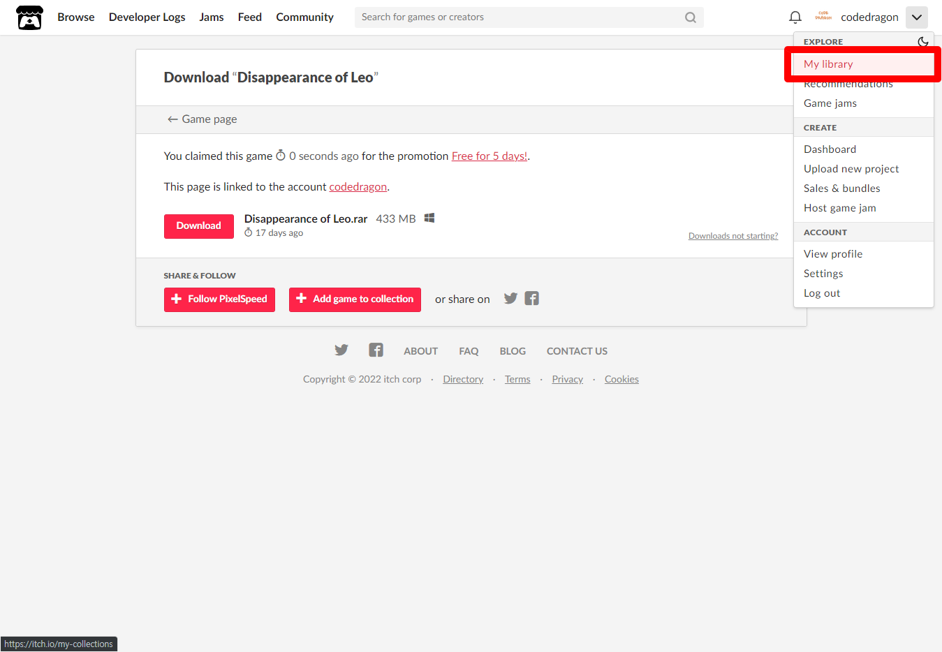 [Claim game]을 클릭하면 "Disappearance of Leo" 게임이 나의 게임 라이브러리에 추가되고 설치파일을 다운받을 수 있는 페이지로 이동됩니다.