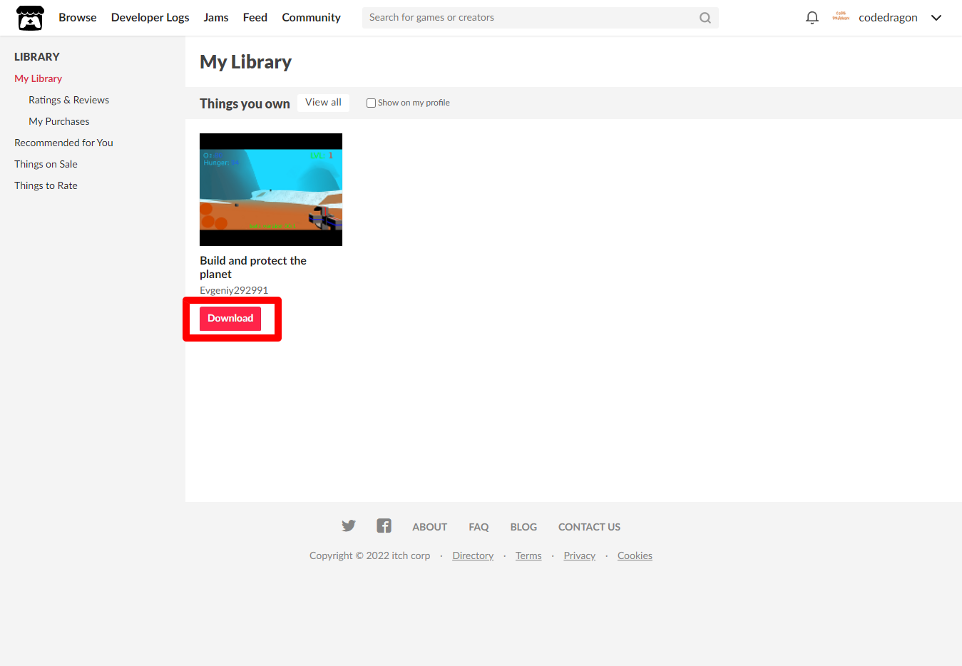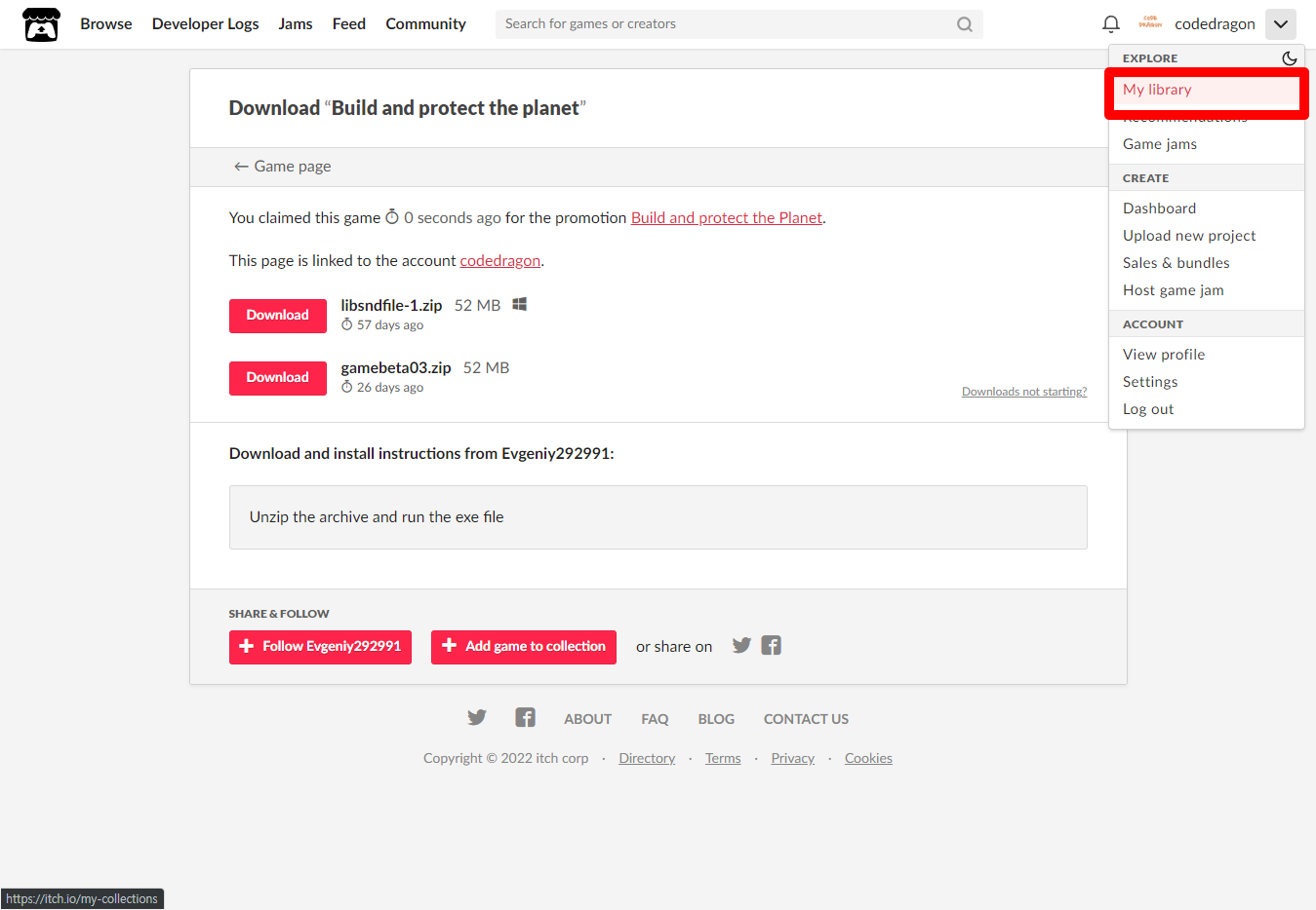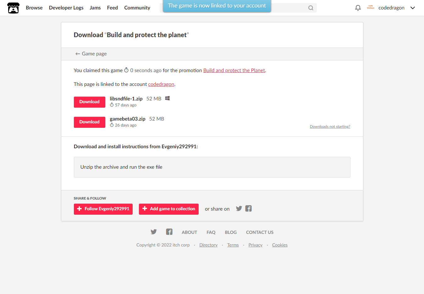 [Claim game]을 클릭하면 "Build and protect the planet" 게임이 나의 게임 라이브러리에 추가되고 설치파일을 다운받을 수 있는 페이지로 이동됩니다.