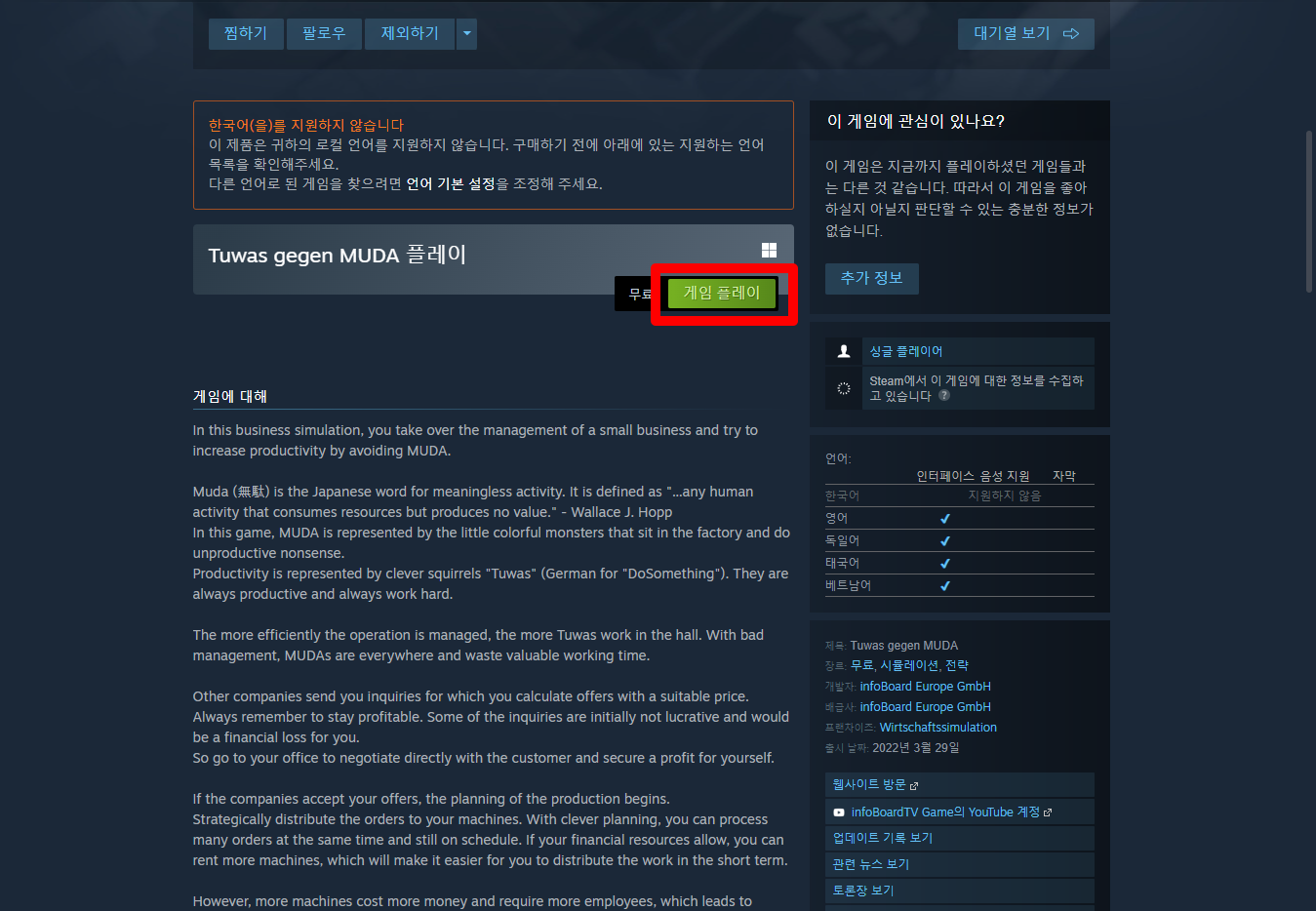 "Tuwas gegen MUDA" 페이지를 내려 [게임 플레이]를 클릭하면 됩니다.