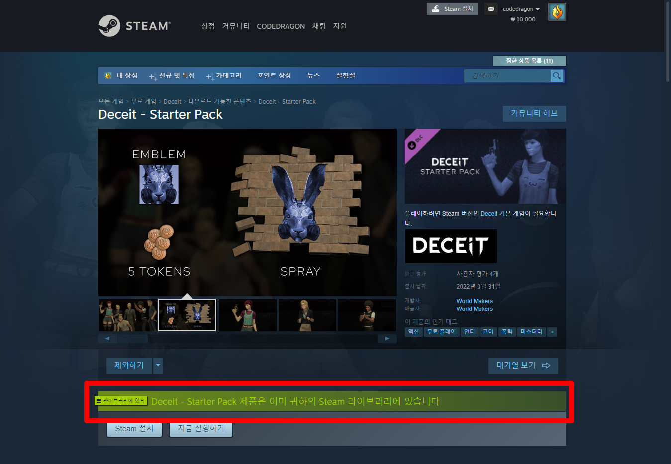 나의 게임 라이브러리에서 등록한 "Deceit - Starter Pack" 항목을 확인할 수 있습니다