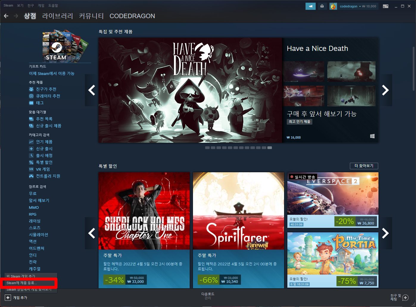 나오는 메뉴에서 [Steam에 제품 등록]을 클릭합니다.