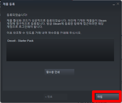 "Deceit - Starter Pack" 게임명이 표시되고 등록이 완료됩니다.
