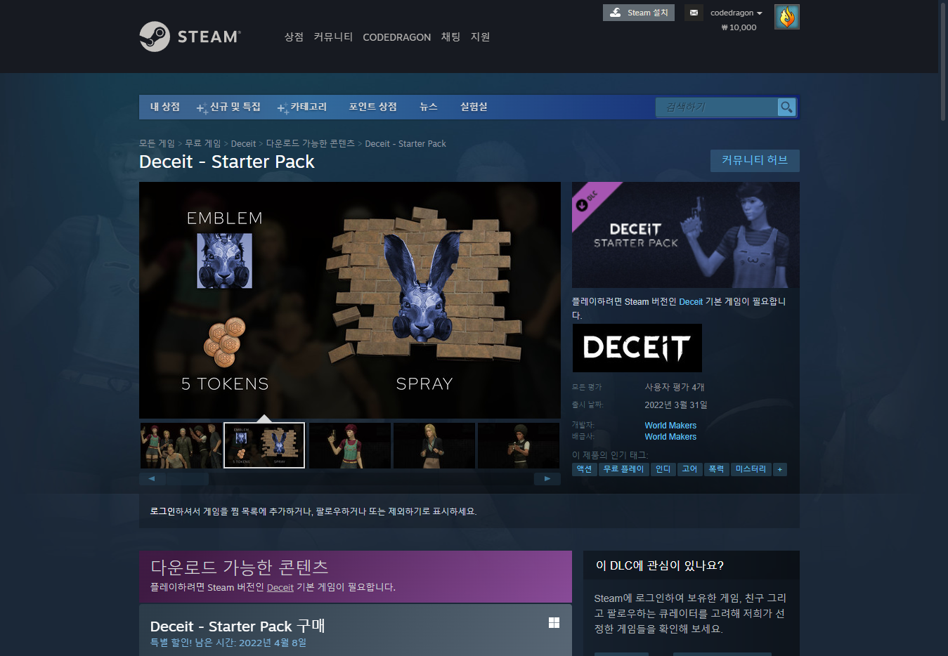 "Deceit - Starter Pack" 해당 DLC를 받기 위해서는 베이스게임(Deceit)을 보유하고 있거나 구매해야 합니다.