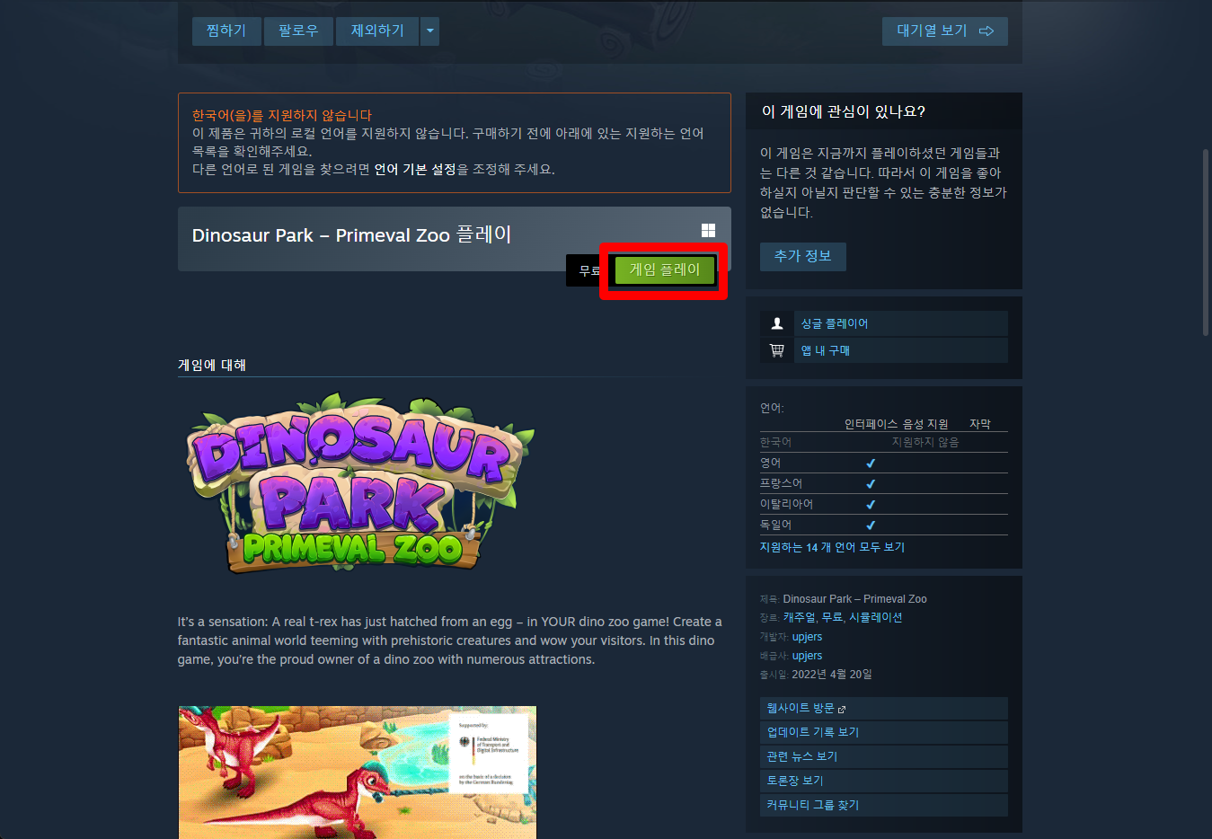 "Dinosaur Park – Primeval Zoo" 페이지를 내려 [게임 플레이]를 클릭하면 됩니다.