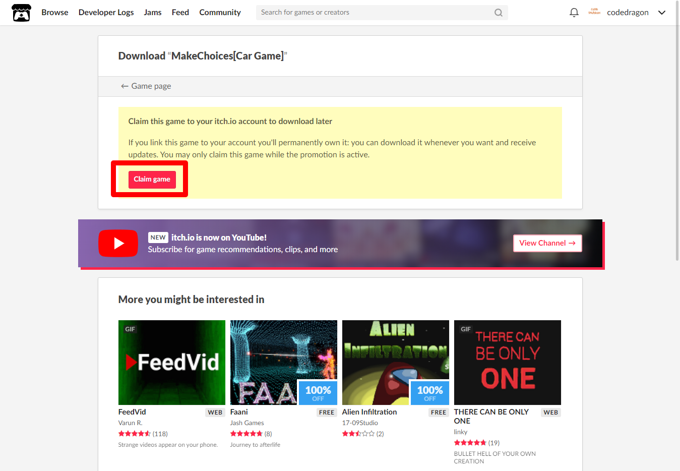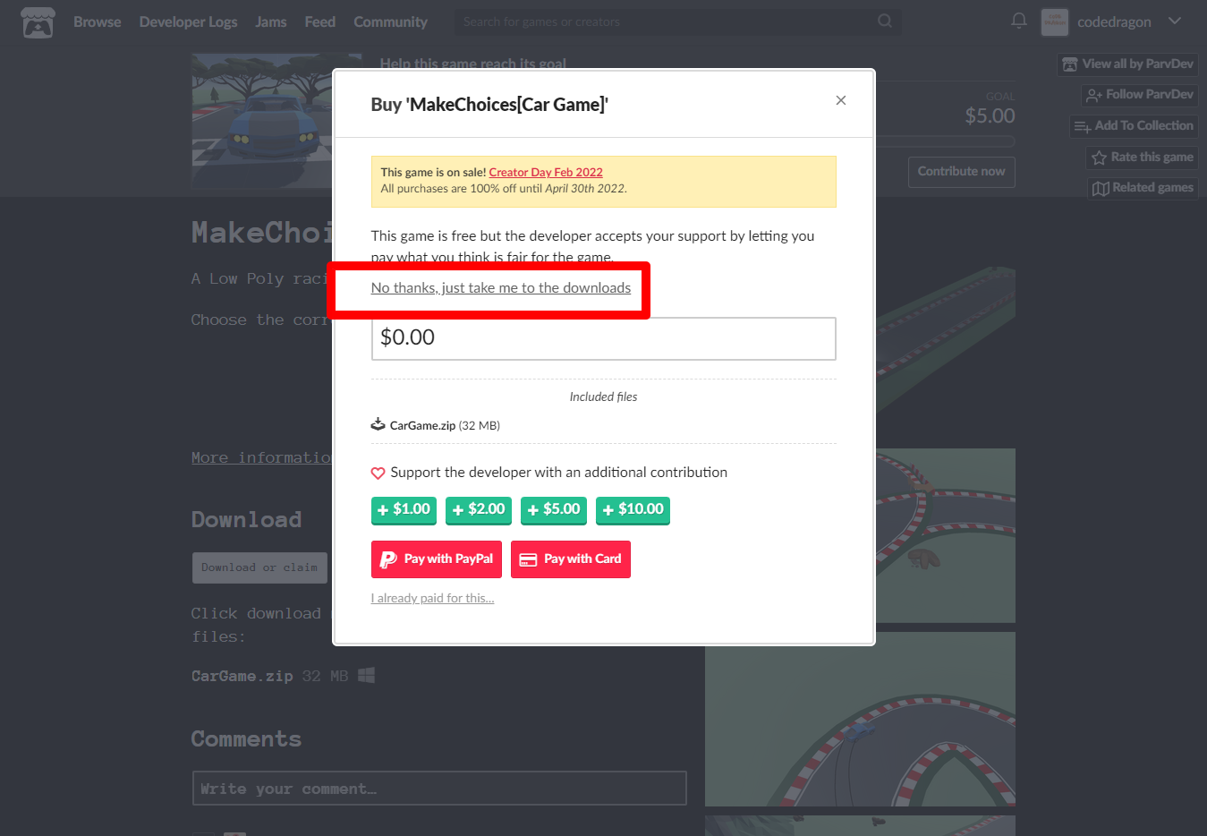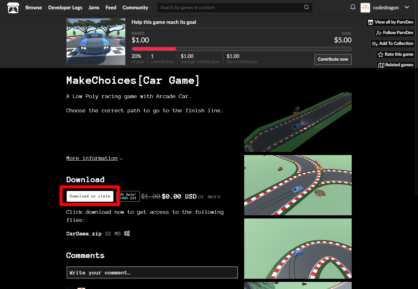 "MakeChoices[Car Game]" 페이지에 있는 [Download or claim]을 클릭합니다.