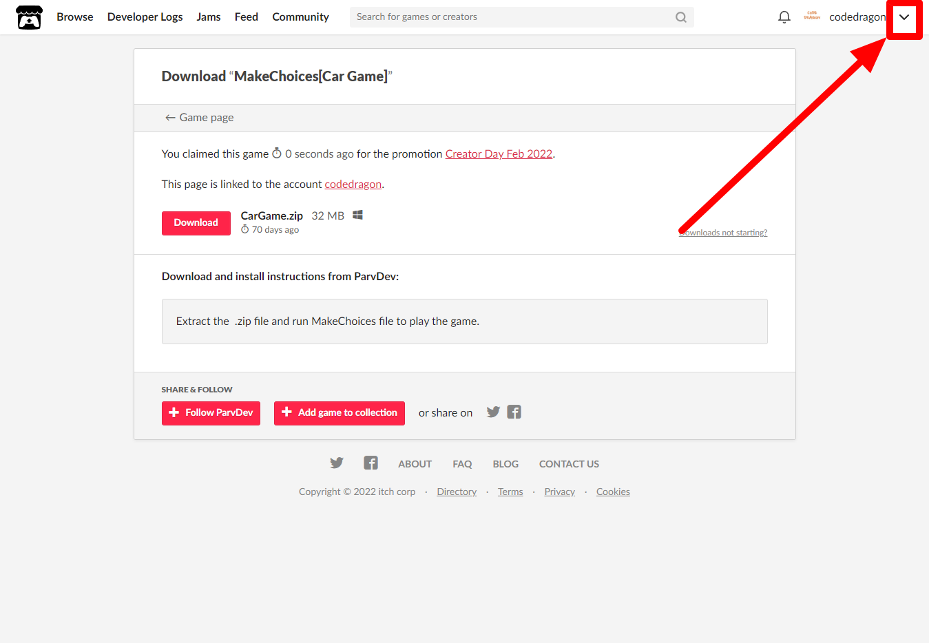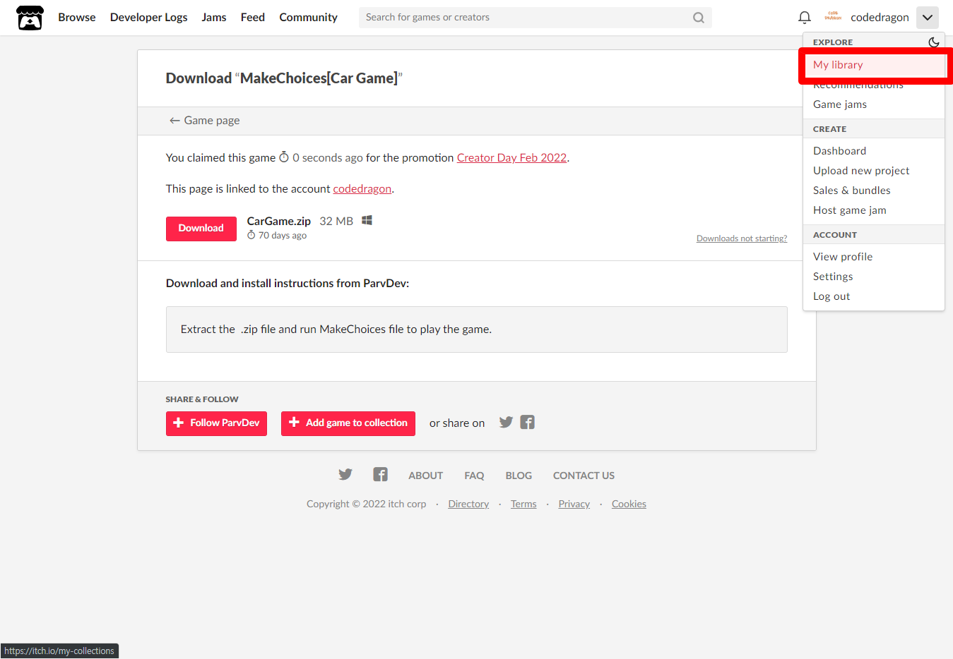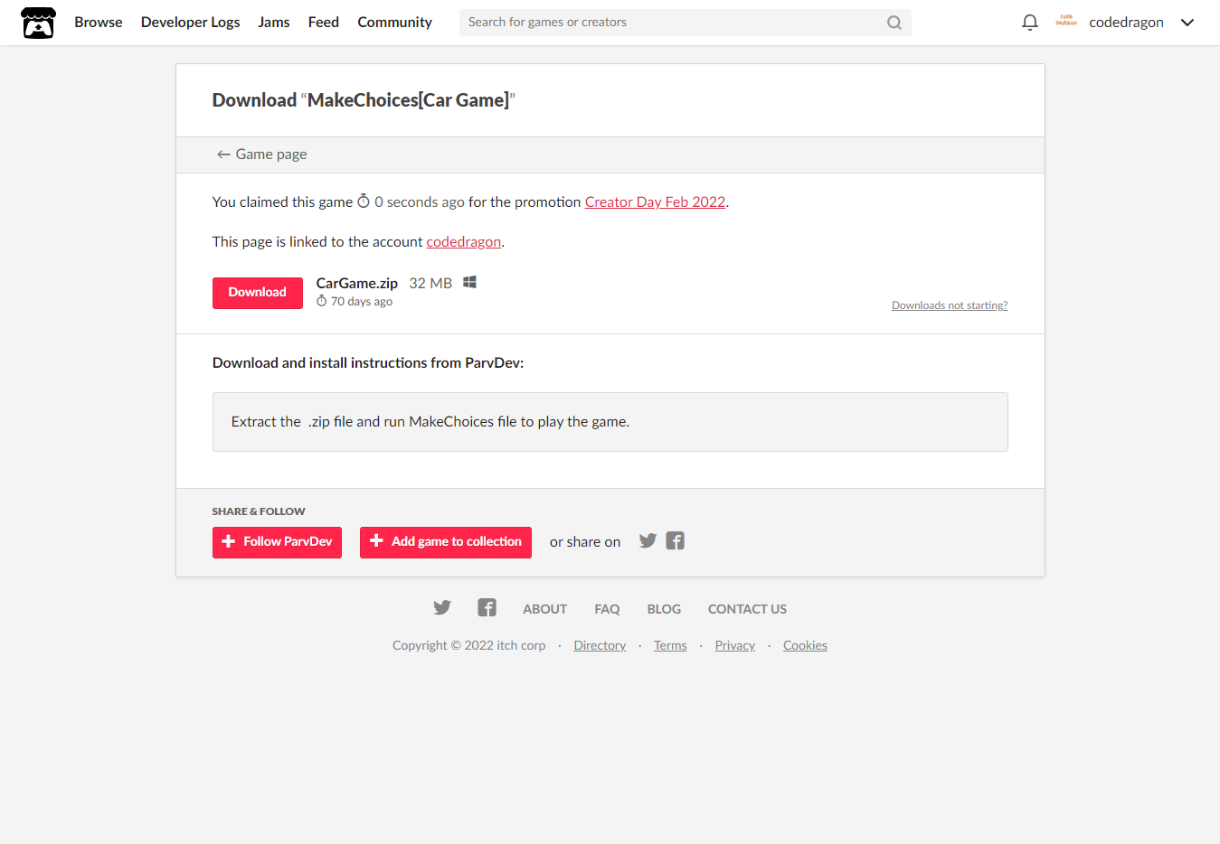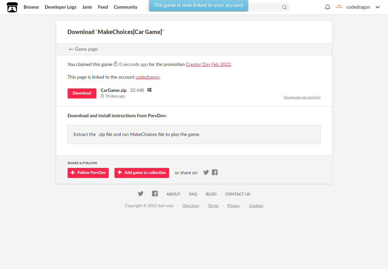 [Claim game]을 클릭하면 "MakeChoices[Car Game]" 게임이 나의 게임 라이브러리에 추가되고 설치파일을 다운받을 수 있는 페이지로 이동됩니다.