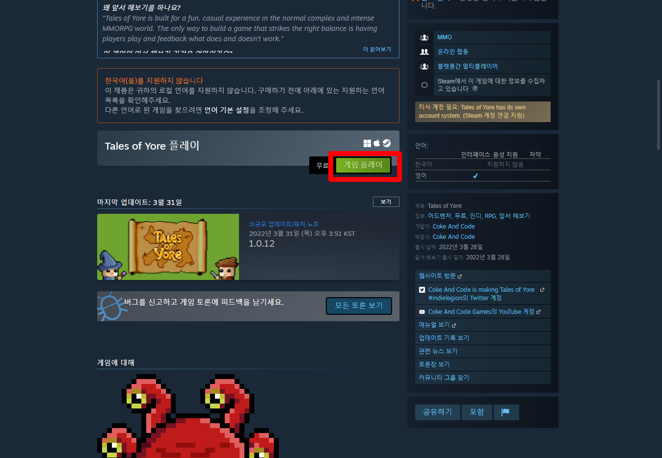 "Tales of Yore" 페이지를 내려 [게임 플레이]를 클릭하면 됩니다.