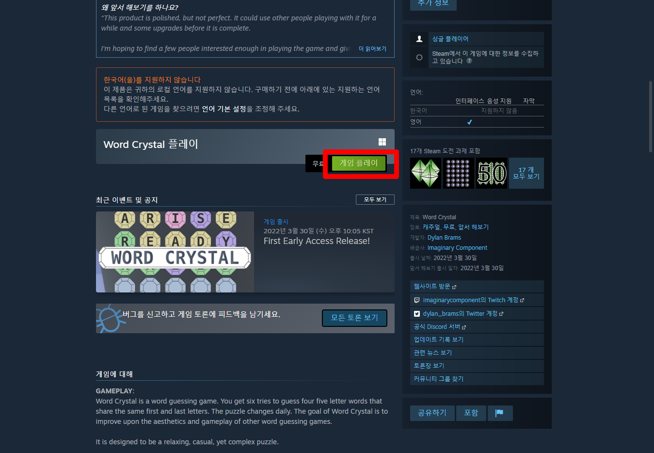 "Word Crystal" 페이지를 내려 [게임 플레이]를 클릭하면 됩니다.