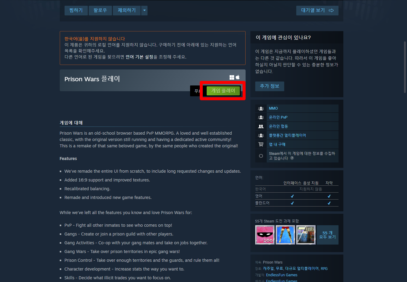 "Prison Wars" 페이지를 내려 [게임 플레이]를 클릭하면 됩니다.