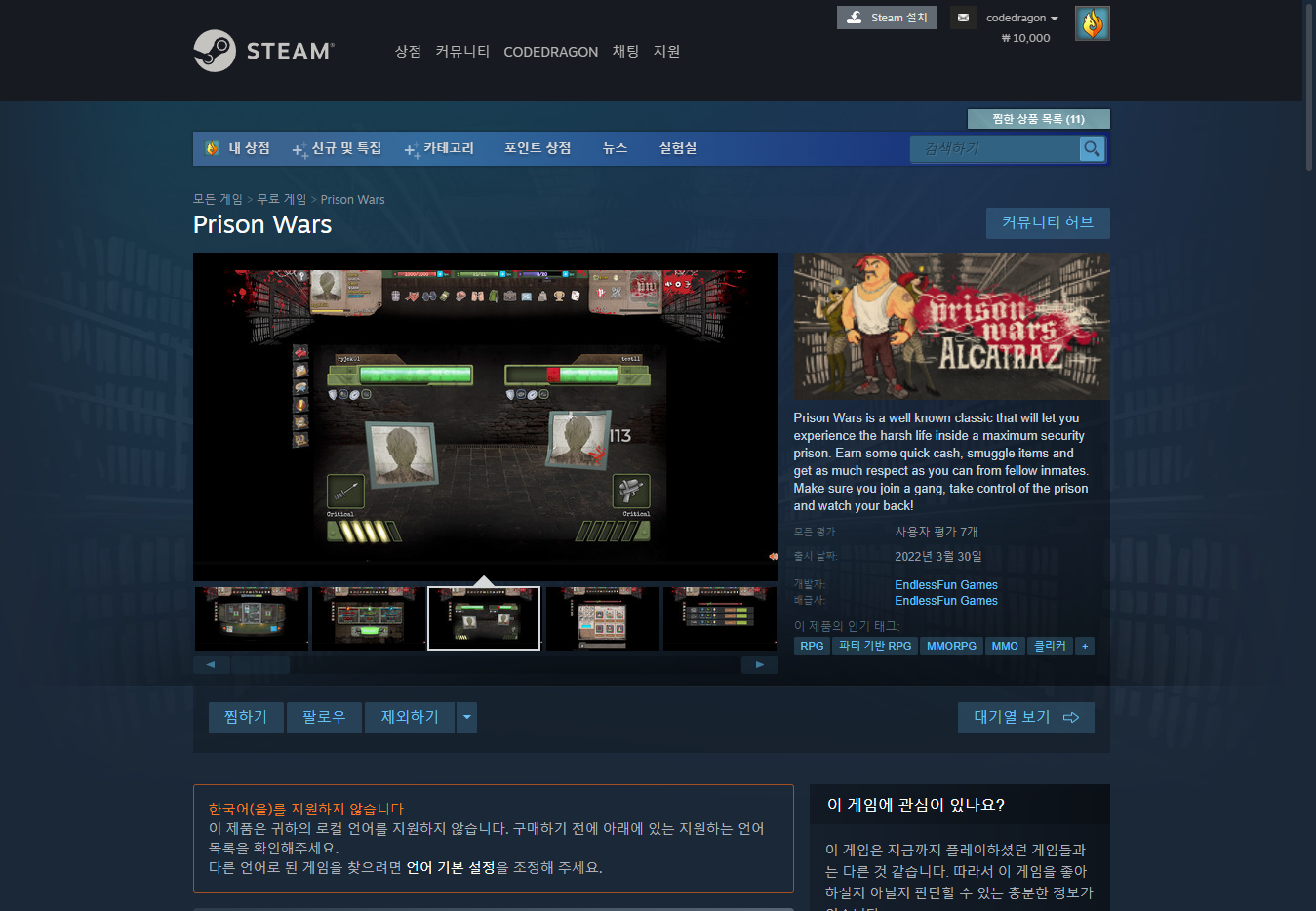"Prison Wars" 스팀 페이지 입니다.