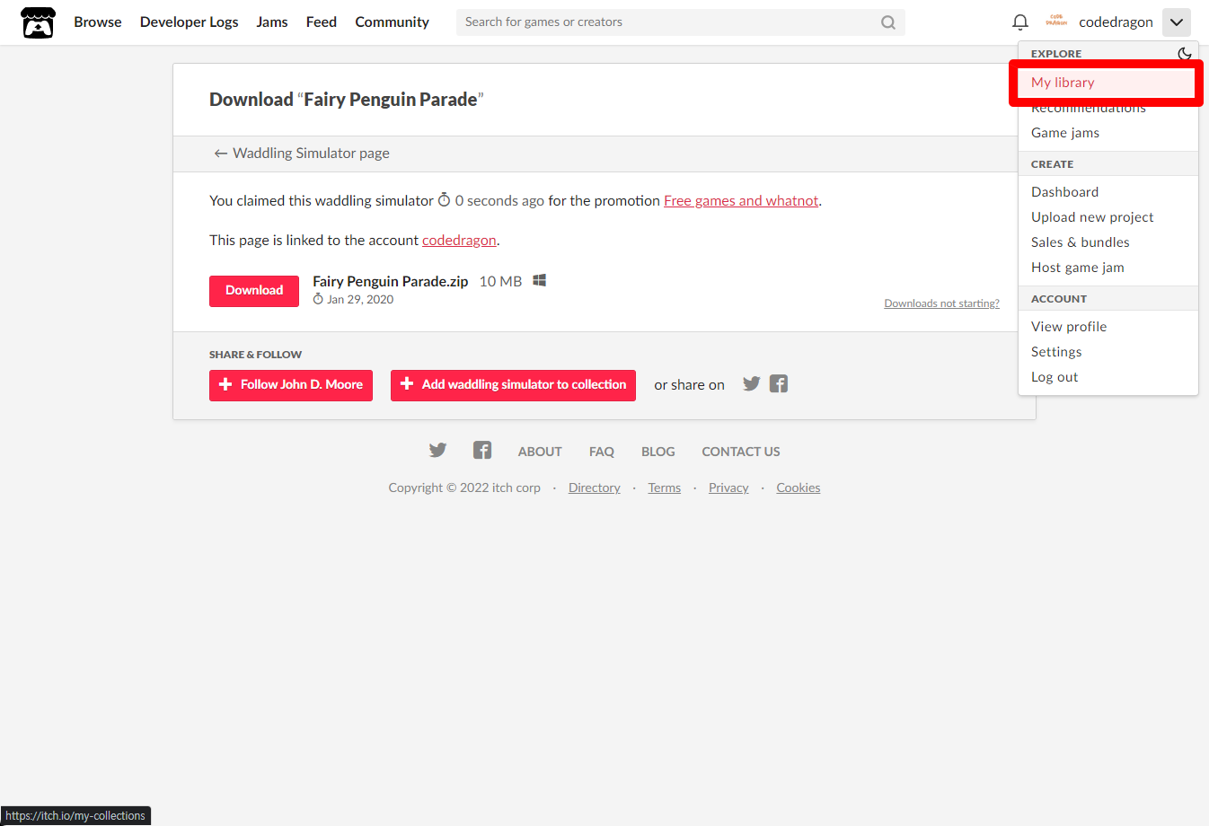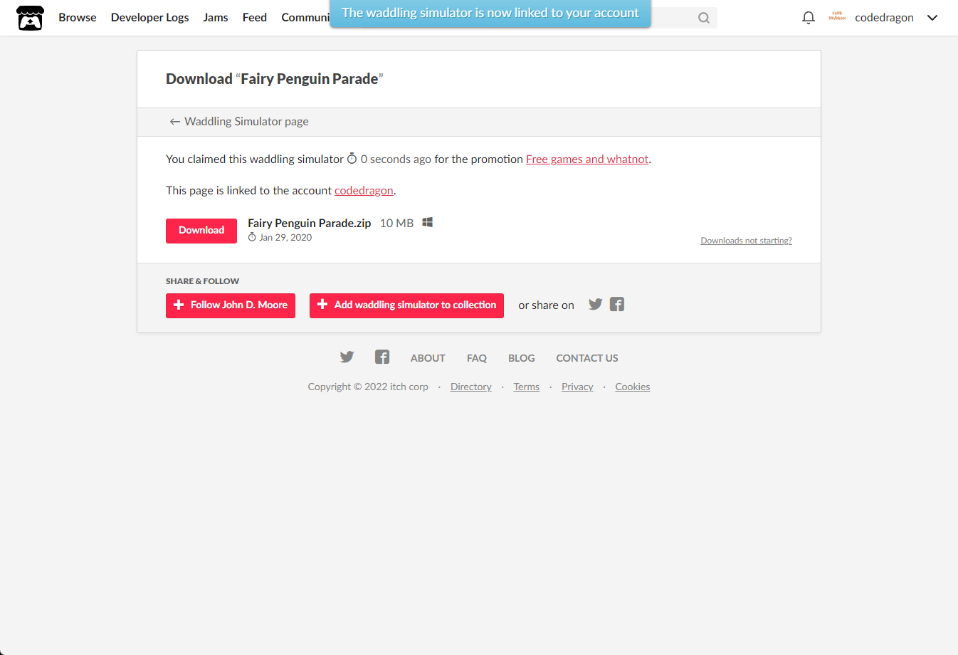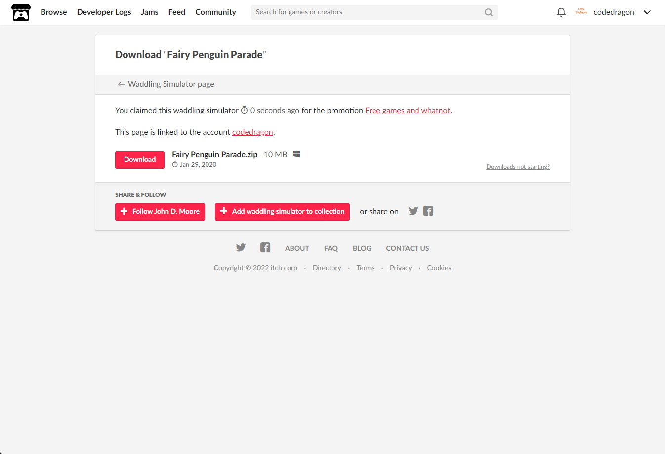 [Claim waddling simulator]을 클릭하면 "Fairy Penguin Parade" 게임이 나의 게임 라이브러리에 추가되고 설치파일을 다운받을 수 있는 페이지로 이동됩니다.