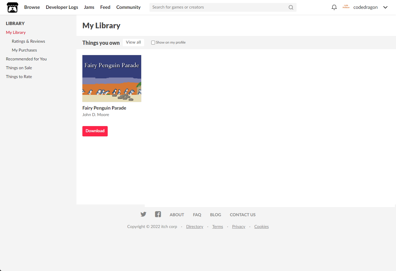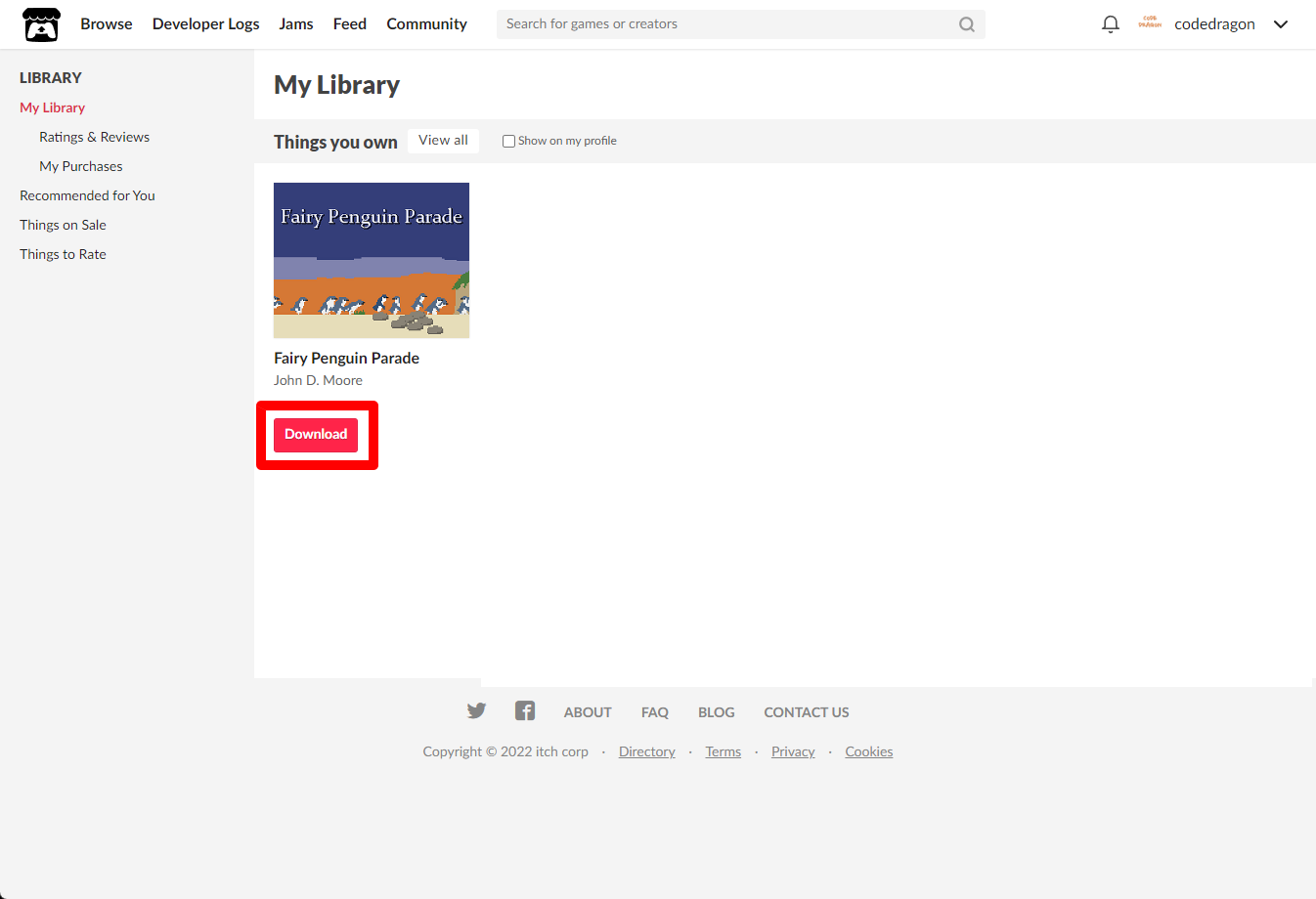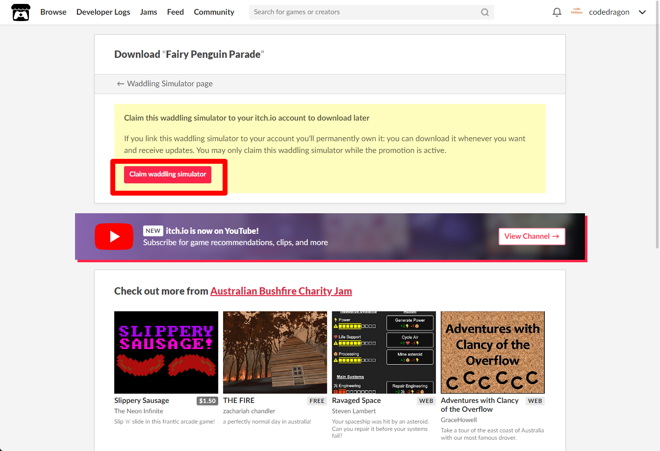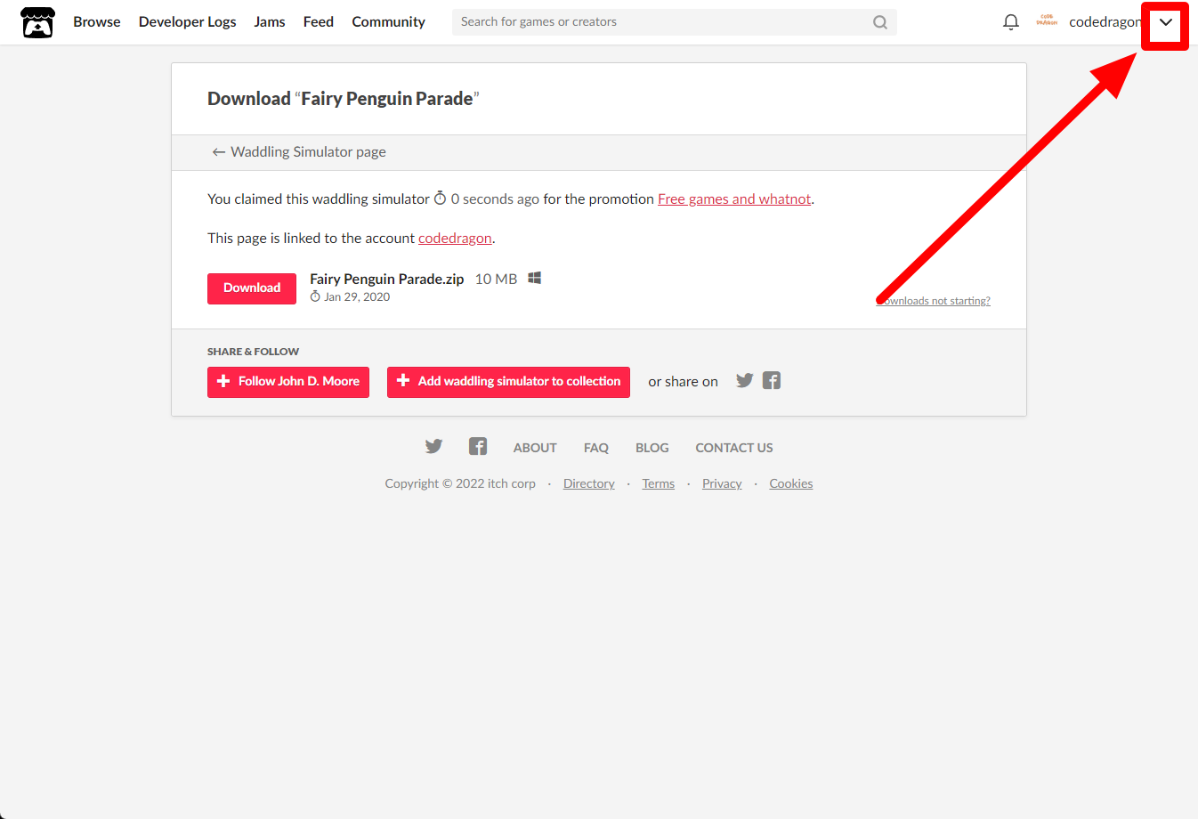 [Claim waddling simulator]을 클릭하면 "Fairy Penguin Parade" 게임이 나의 게임 라이브러리에 추가되고 설치파일을 다운받을 수 있는 페이지로 이동됩니다.