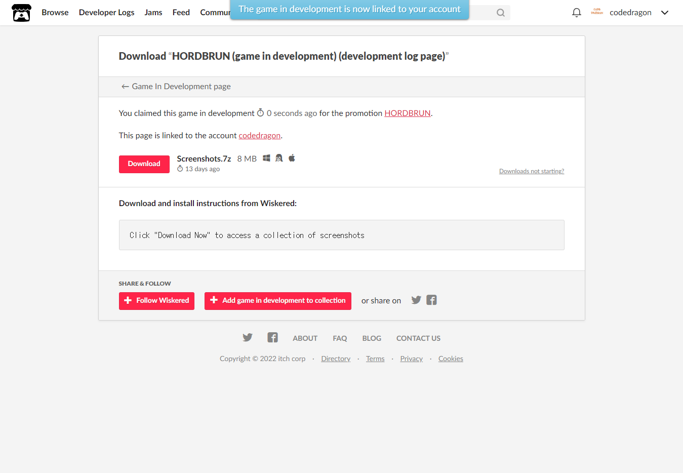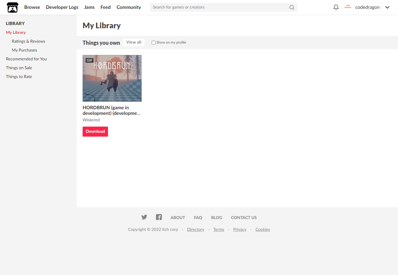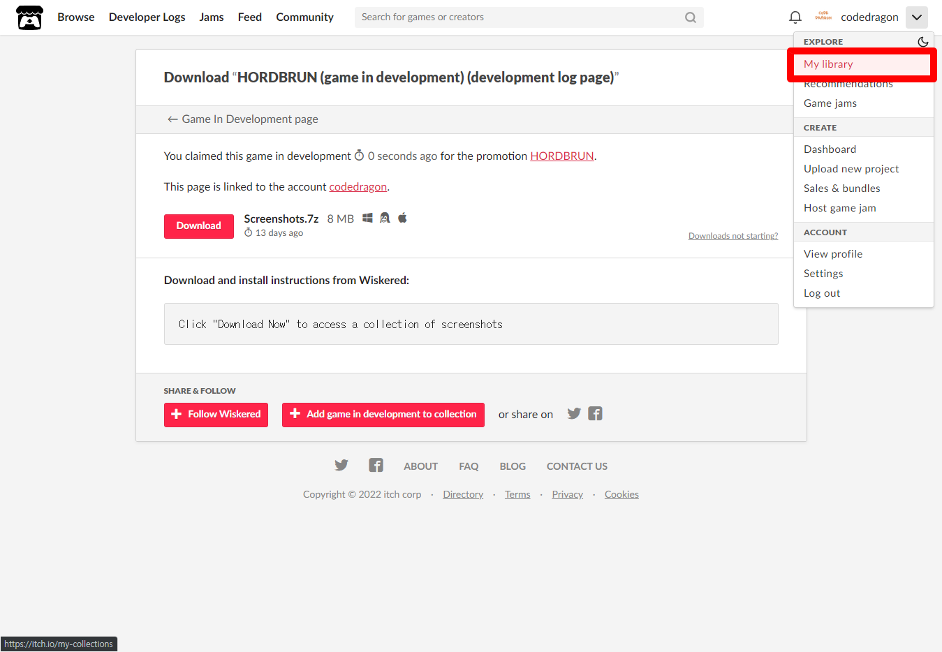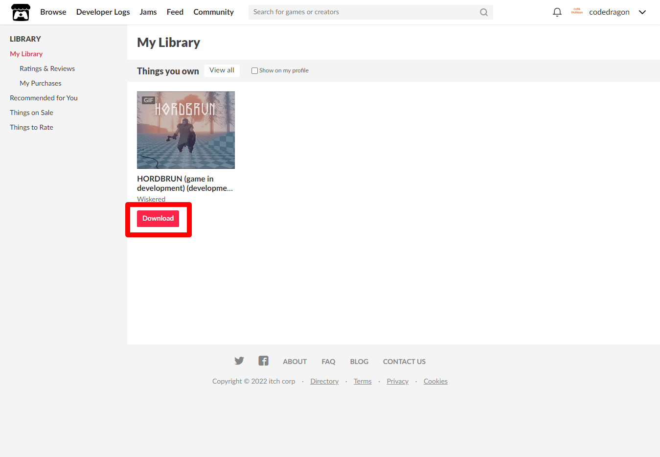 [Claim game in development]을 클릭하면 "HORDBRUN" 게임이 나의 게임 라이브러리에 추가되고 설치파일을 다운받을 수 있는 페이지로 이동됩니다.