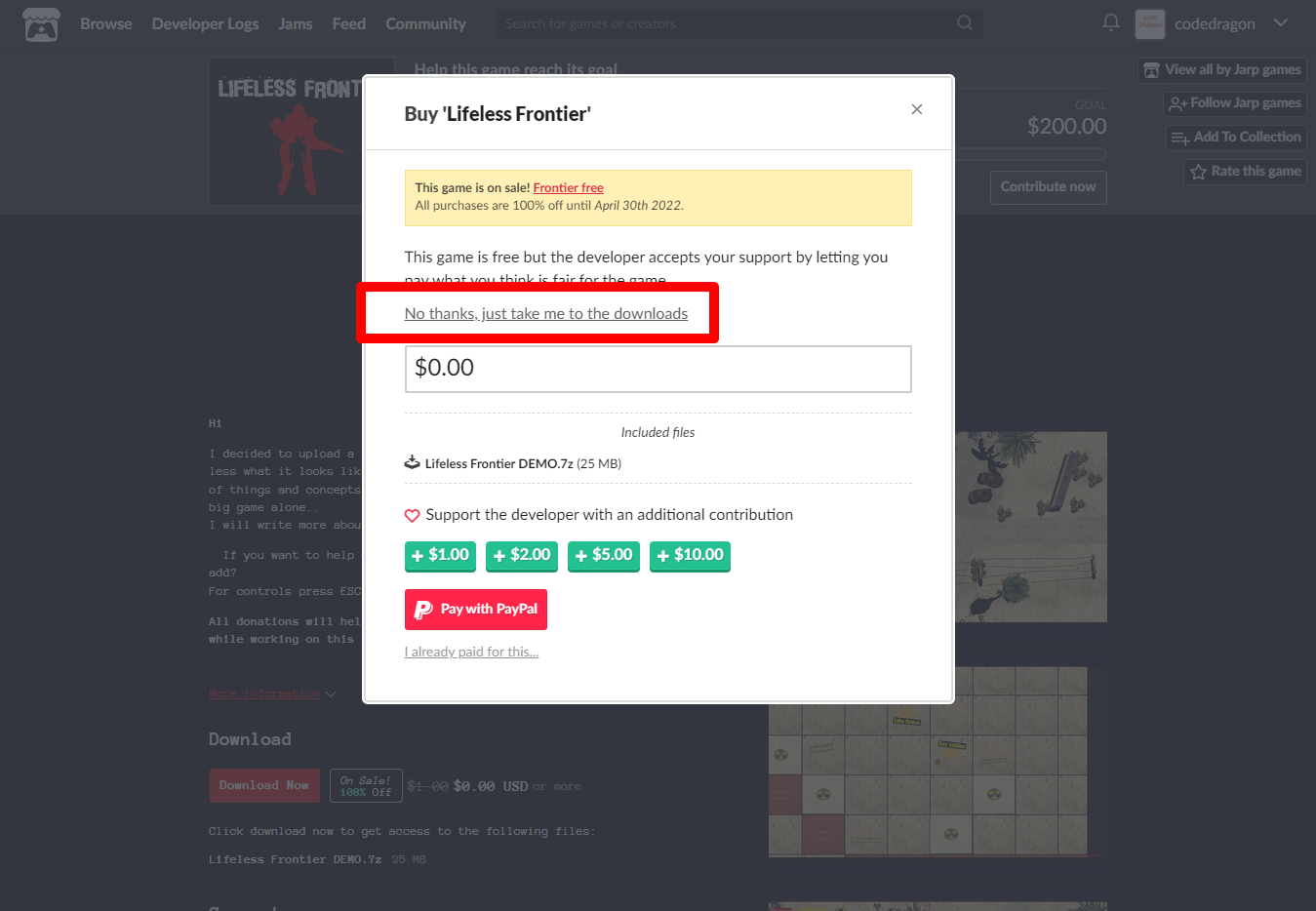 "Lifeless Frontier" 페이지에 있는 [Download or claim]을 클릭합니다.