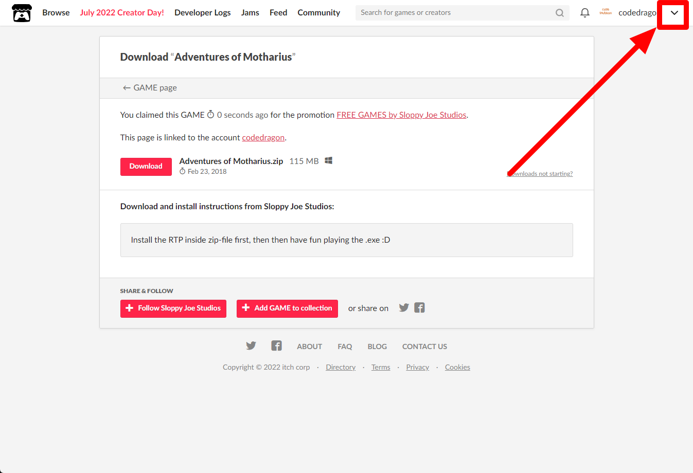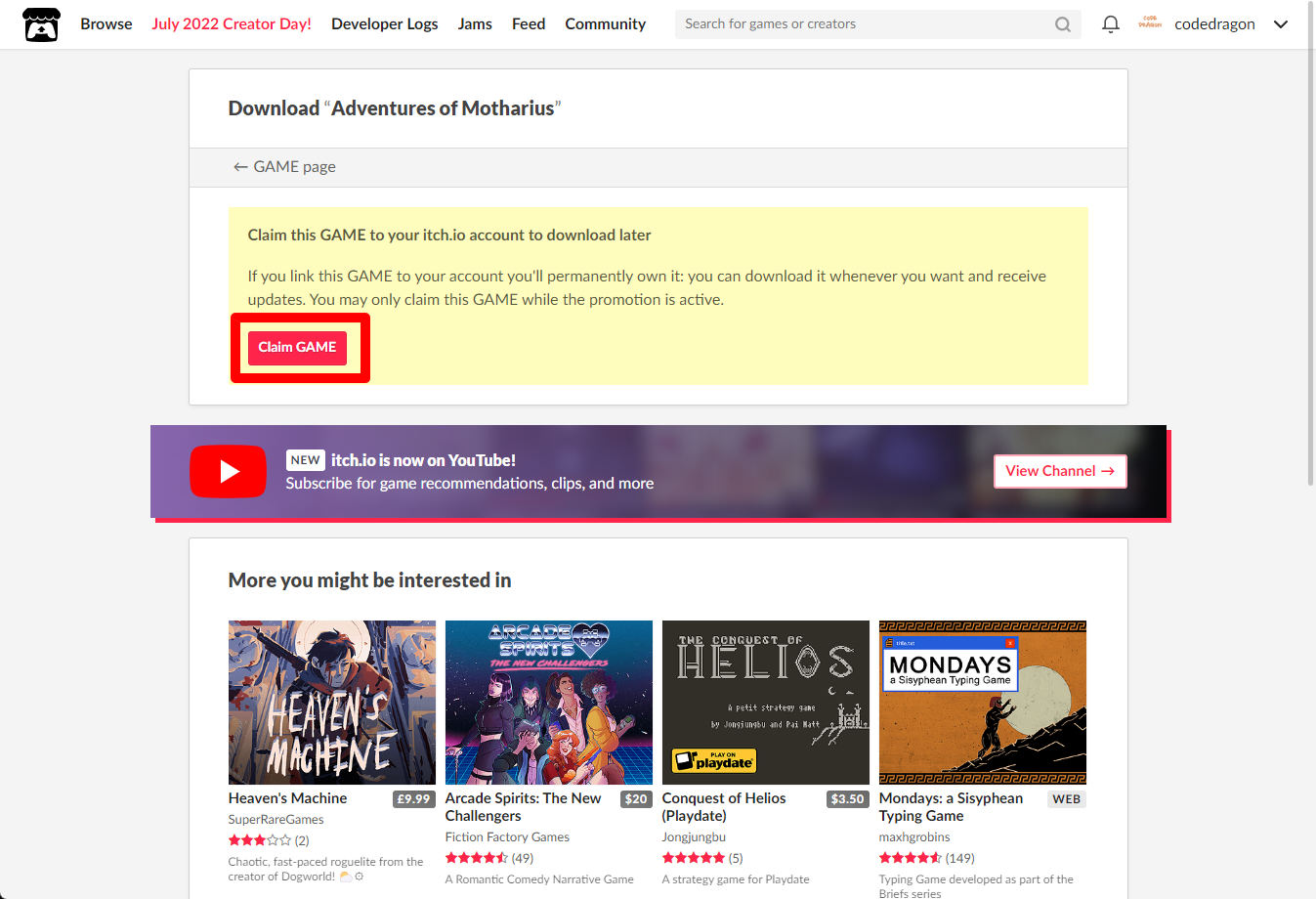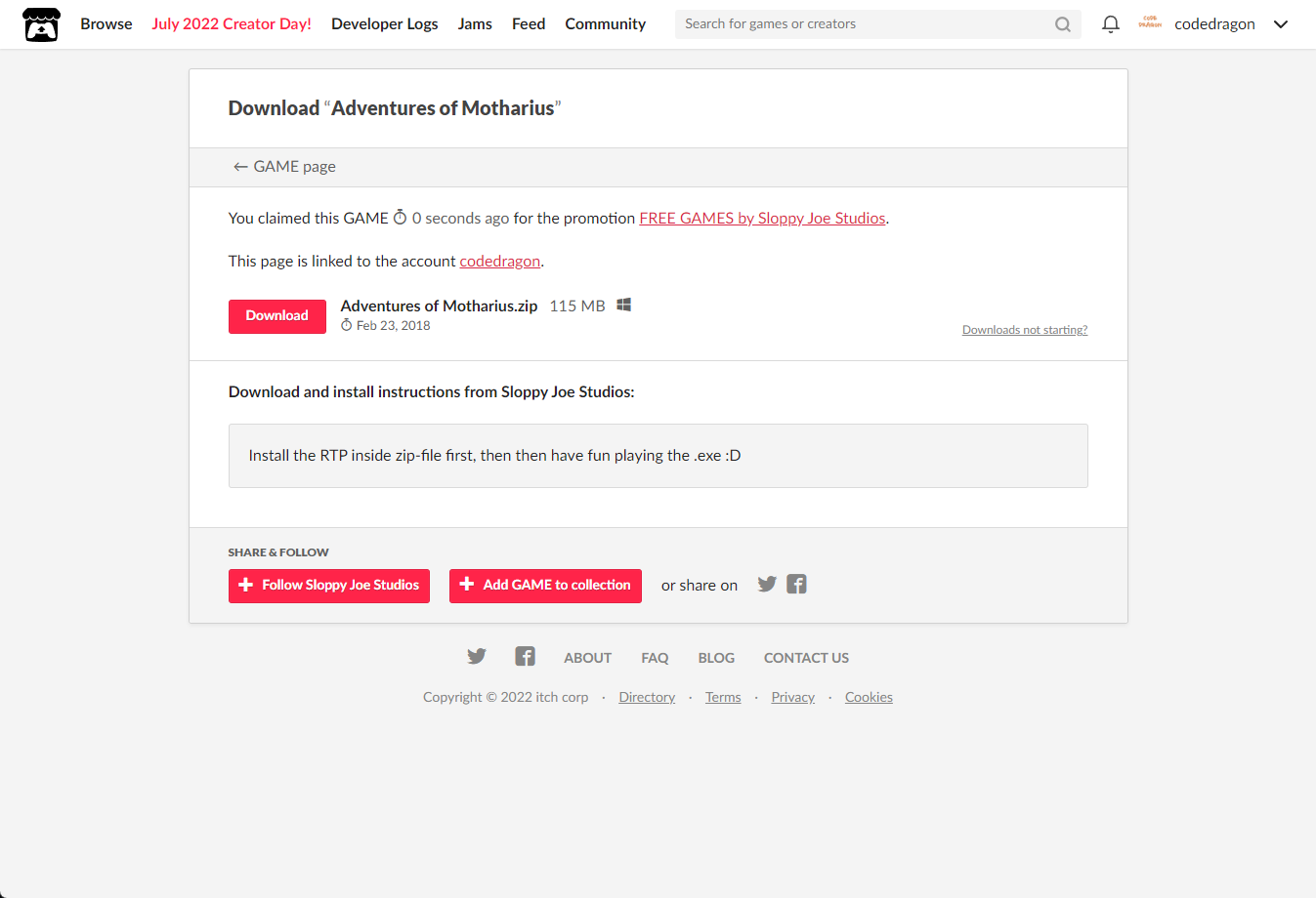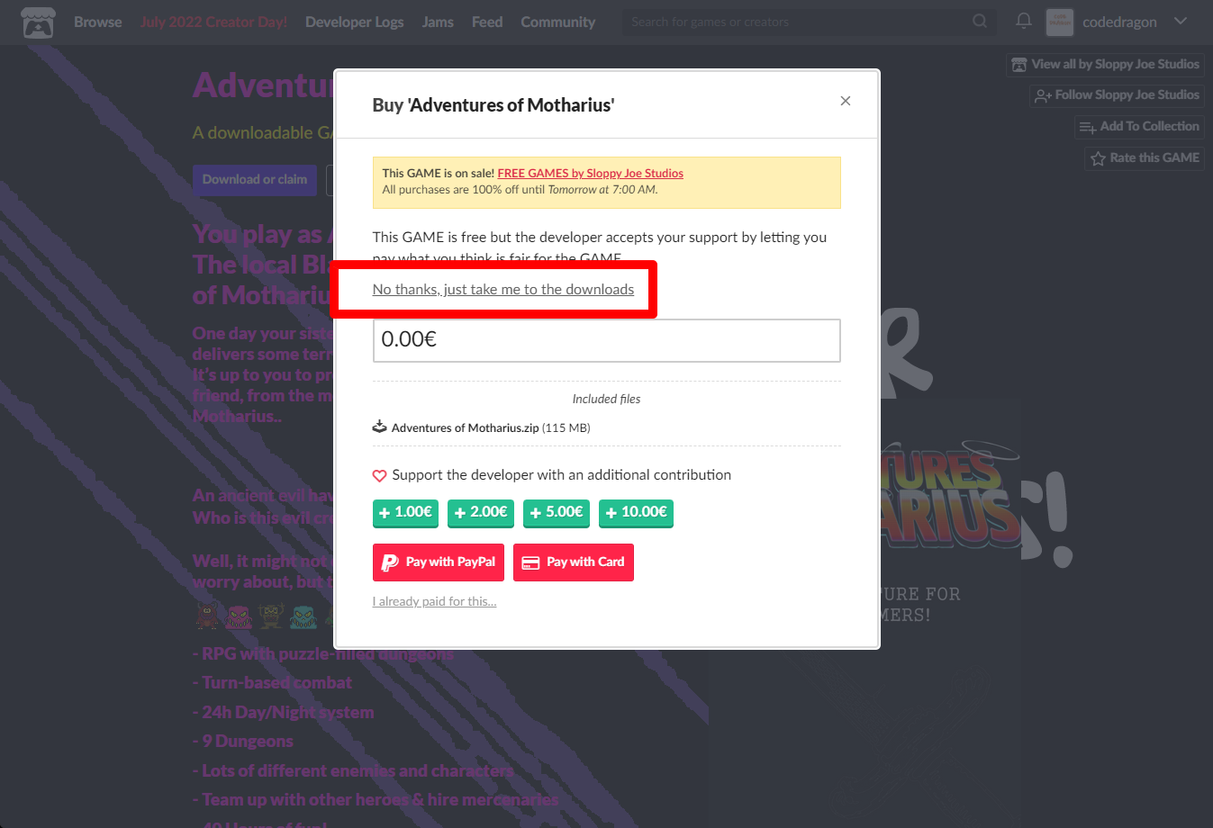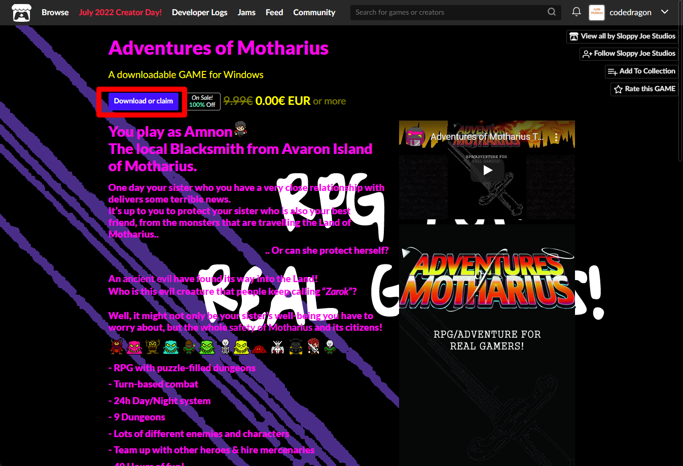 "Adventures of Motharius" 페이지에 있는 [Download or claim]을 클릭합니다.