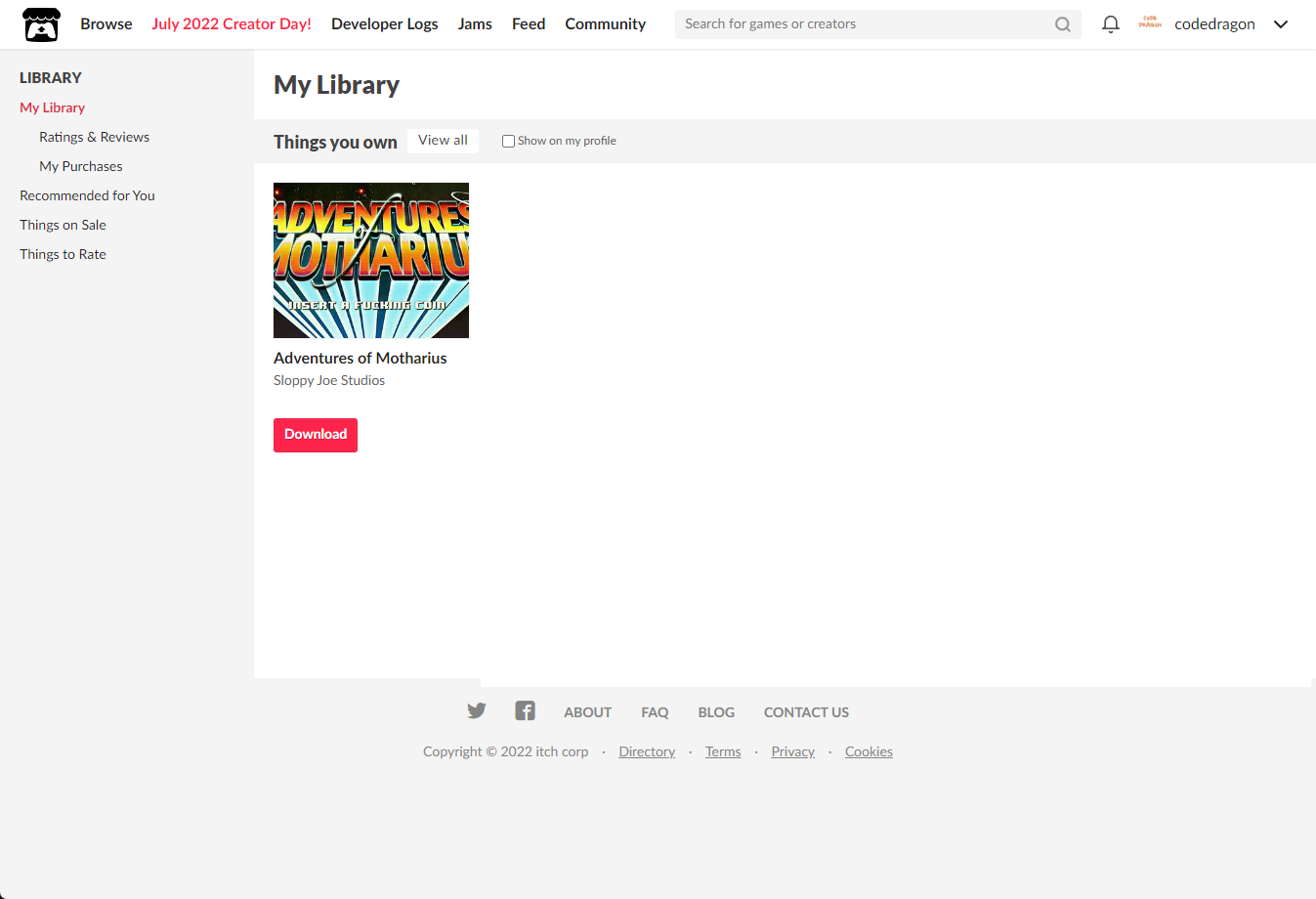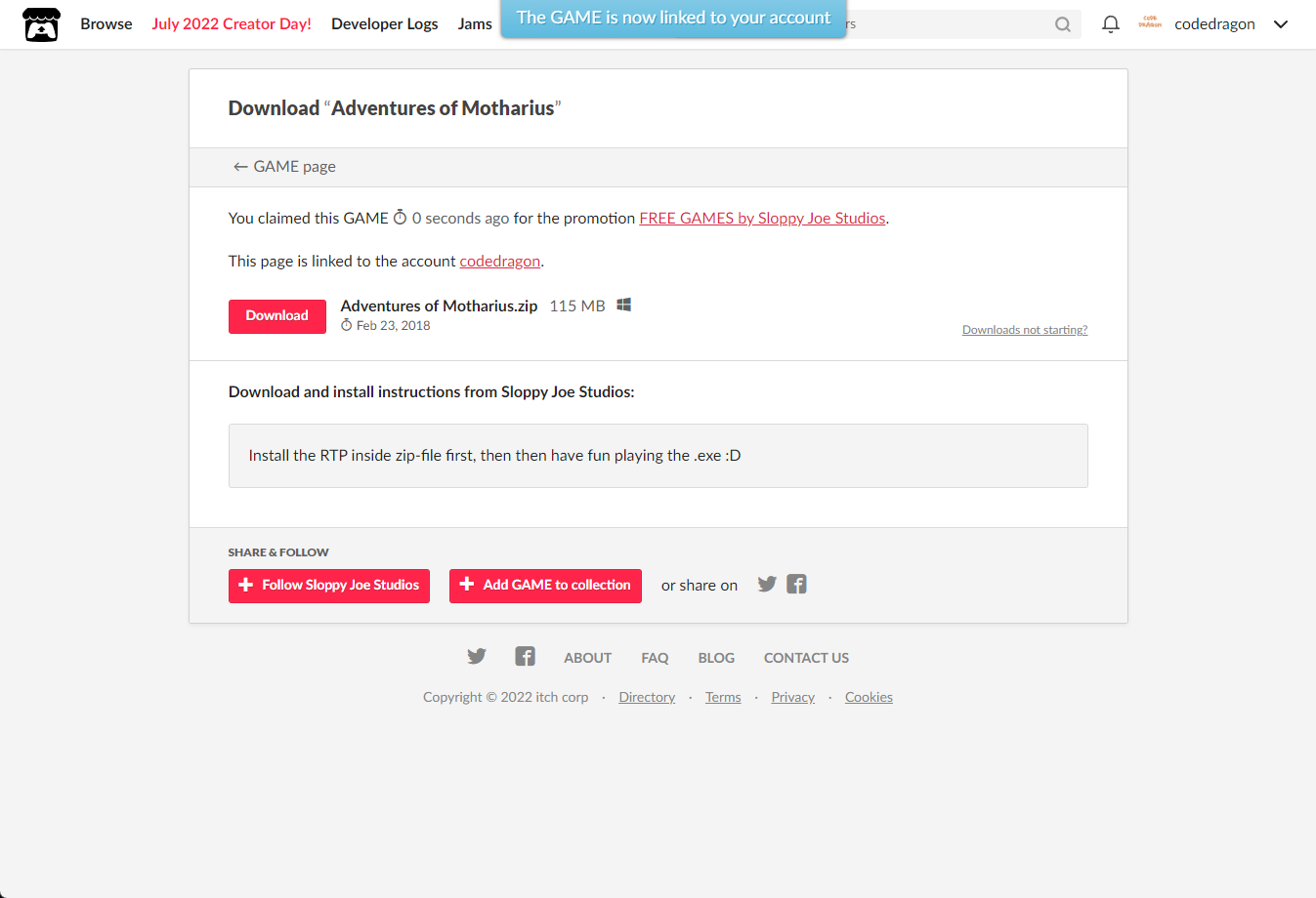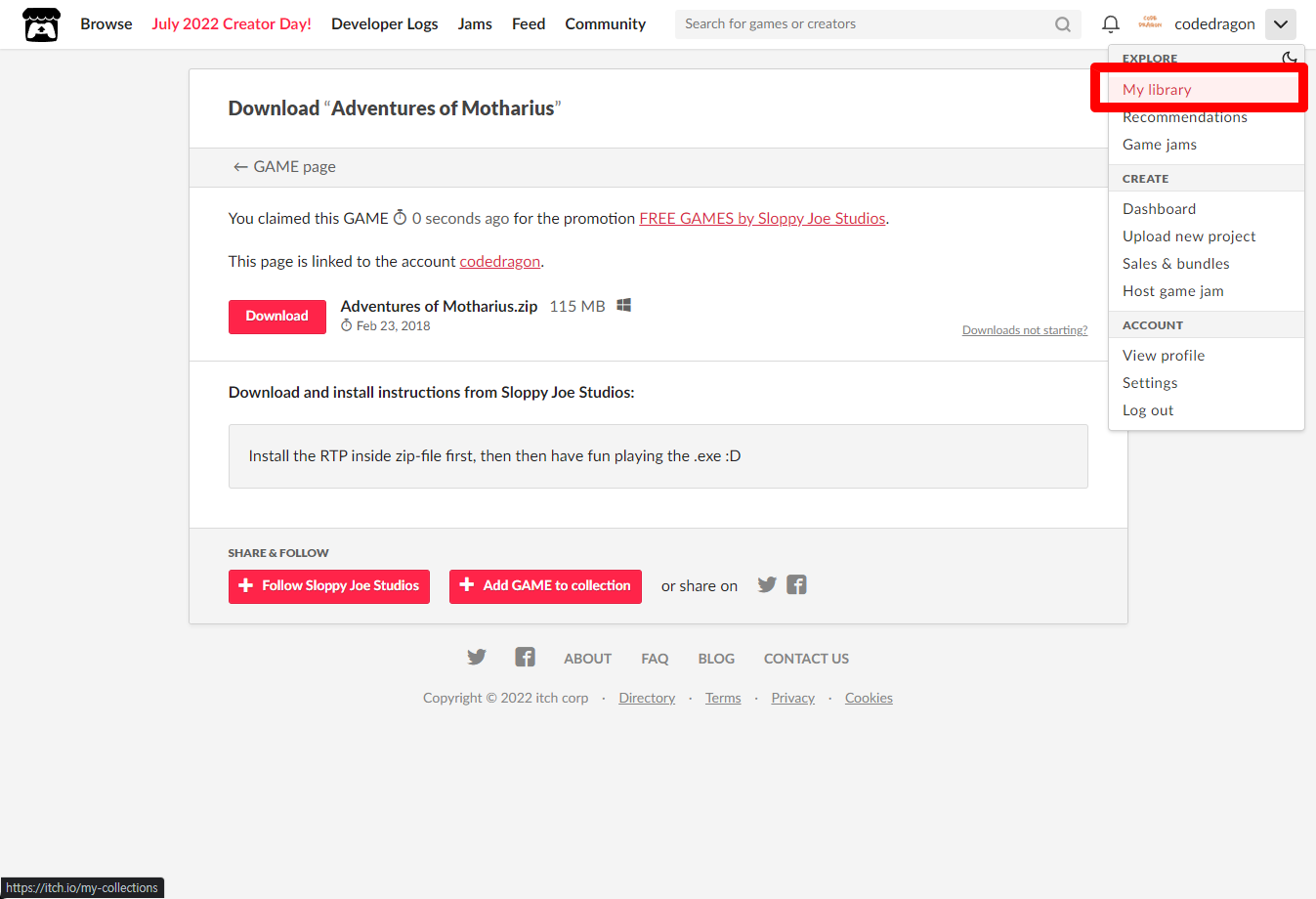 [Claim game]을 클릭하면 "Adventures of Motharius" 게임이 나의 게임 라이브러리에 추가되고 설치파일을 다운받을 수 있는 페이지로 이동됩니다.