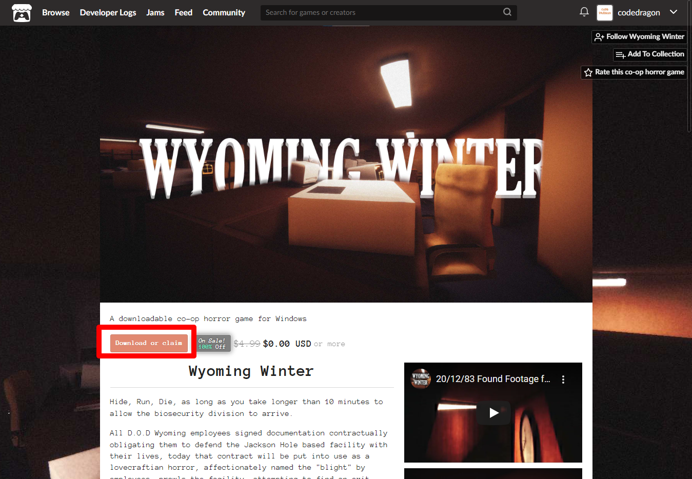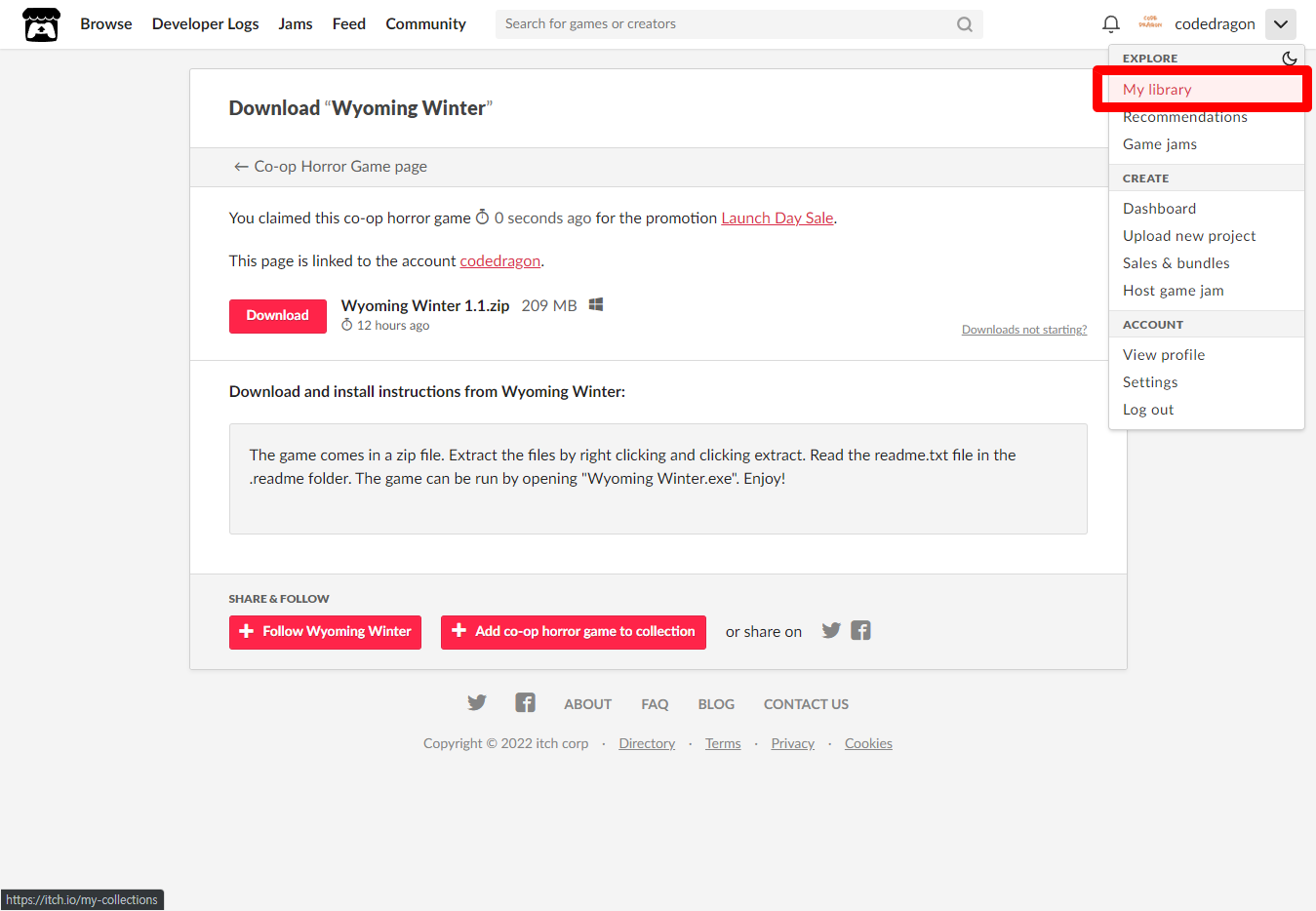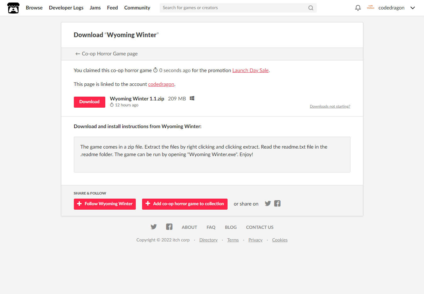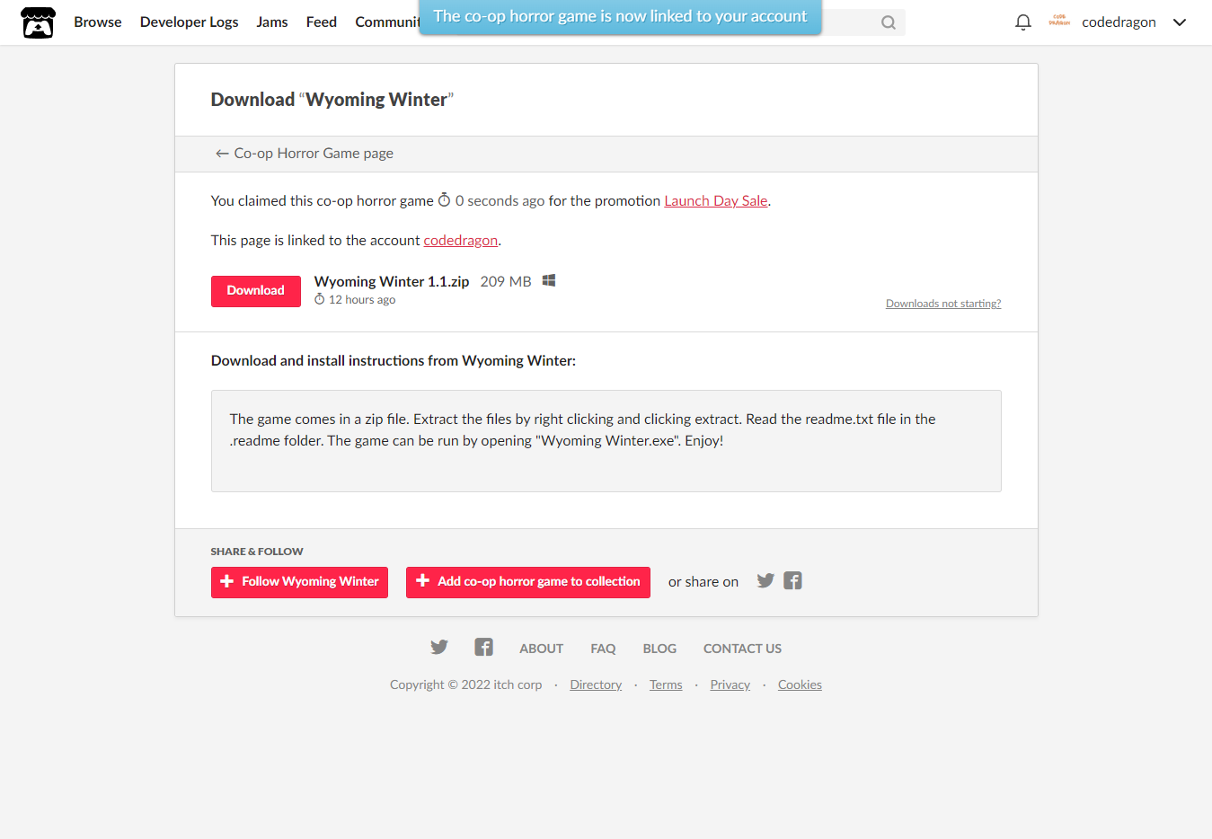 [Claim co-op horror game]을 클릭하면 "Wyoming Winter" 게임이 나의 게임 라이브러리에 추가되고 설치파일을 다운받을 수 있는 페이지로 이동됩니다.