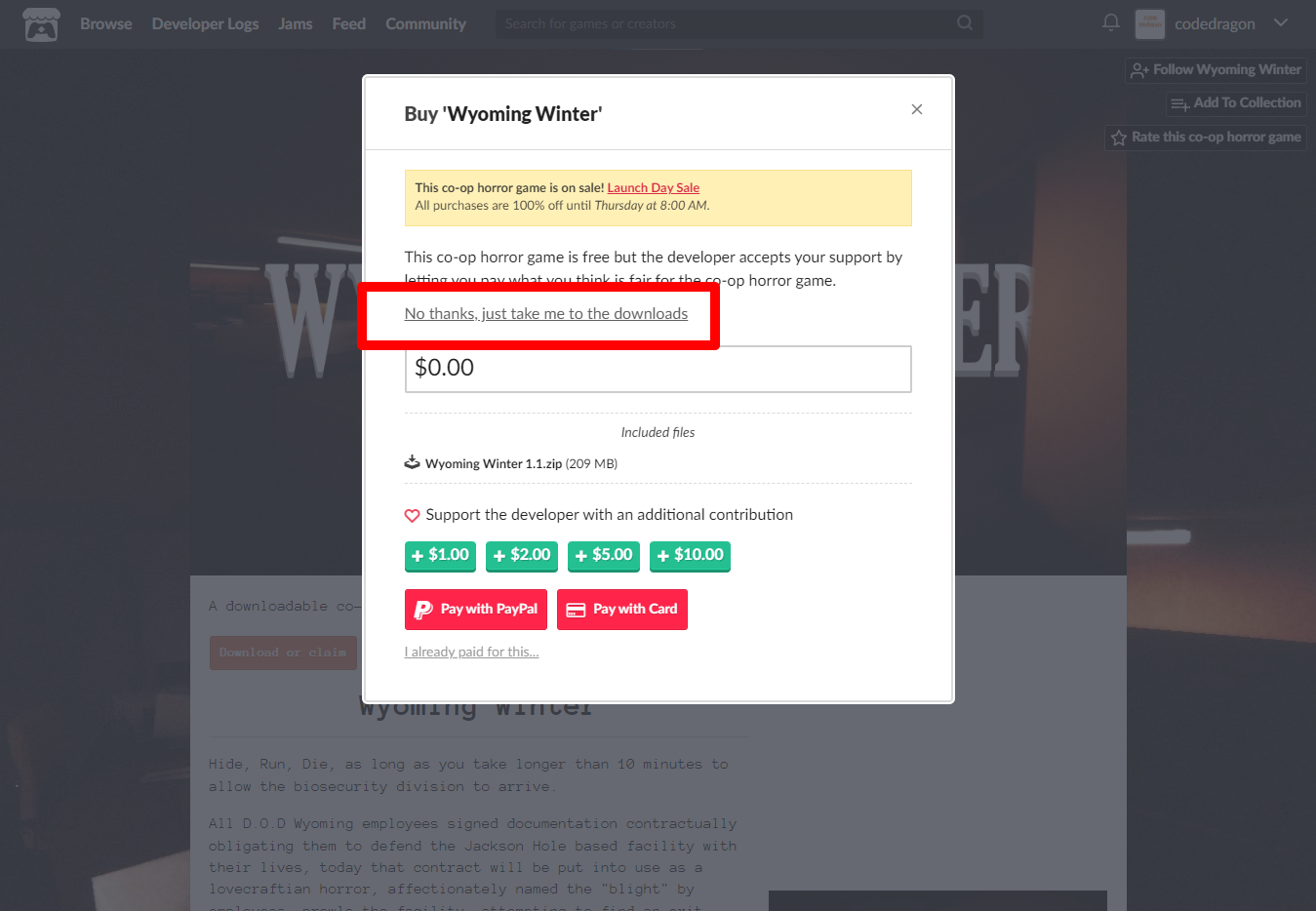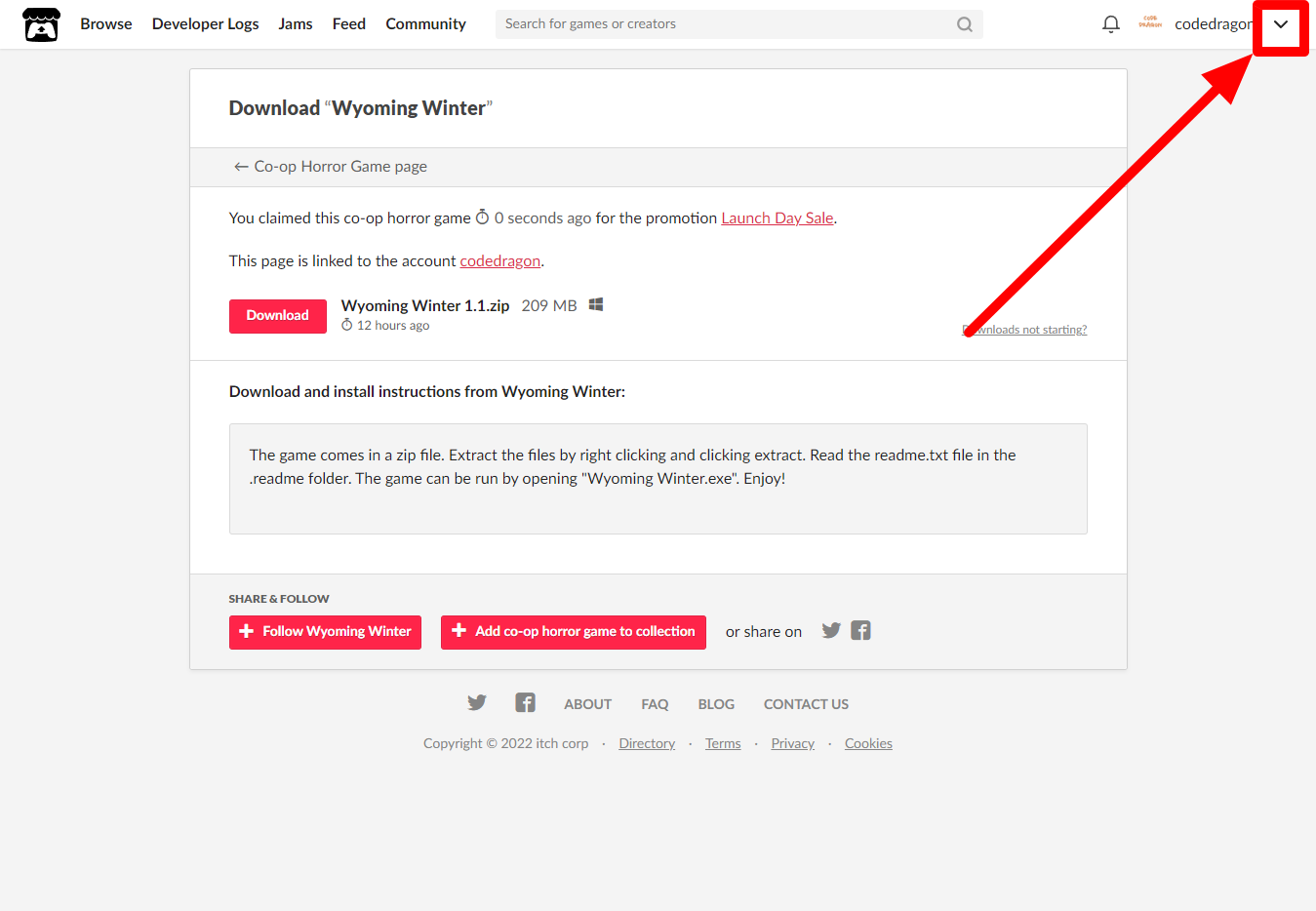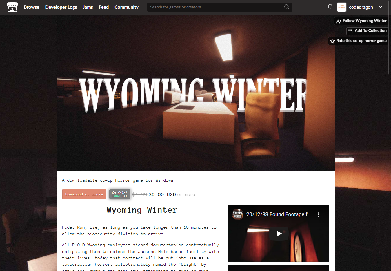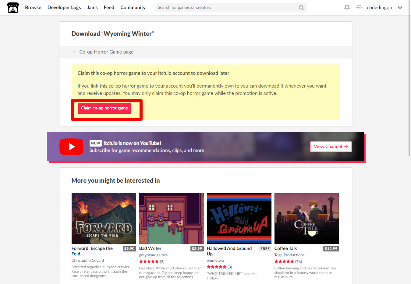 [Claim co-op horror game]을 클릭하면 "Wyoming Winter" 게임이 나의 게임 라이브러리에 추가되고 설치파일을 다운받을 수 있는 페이지로 이동됩니다.