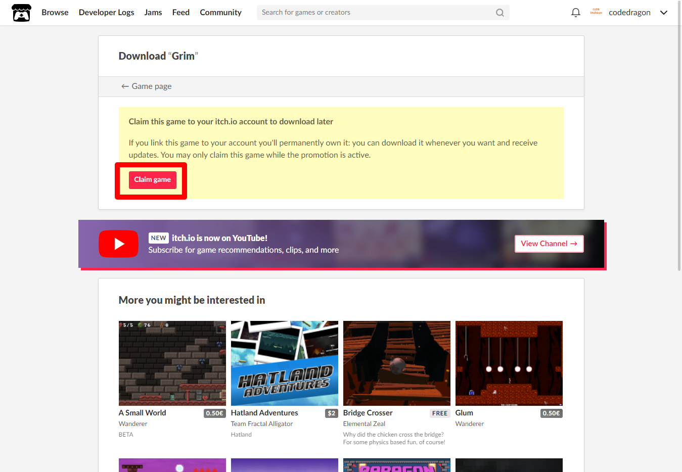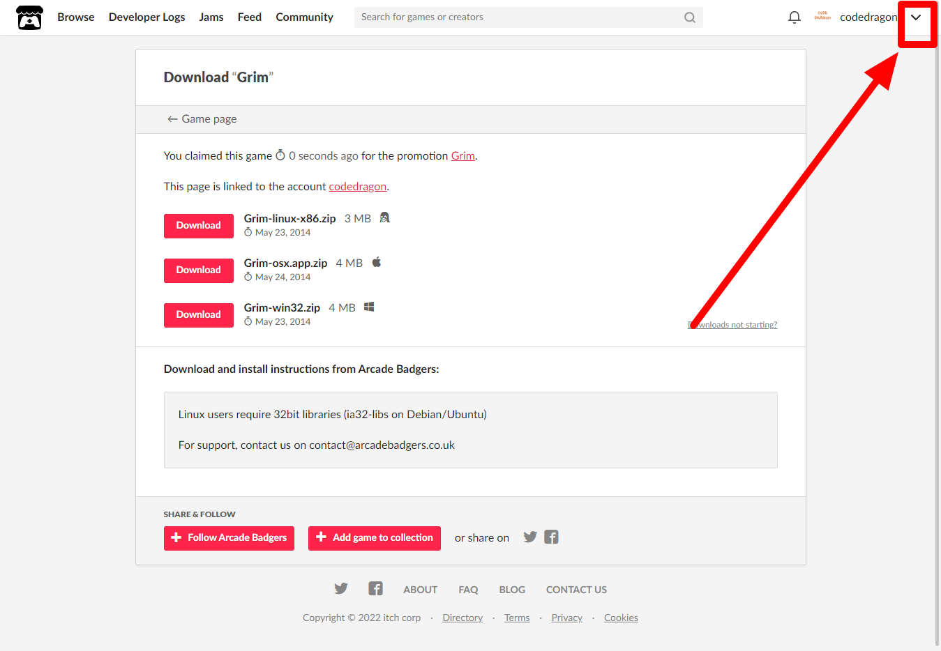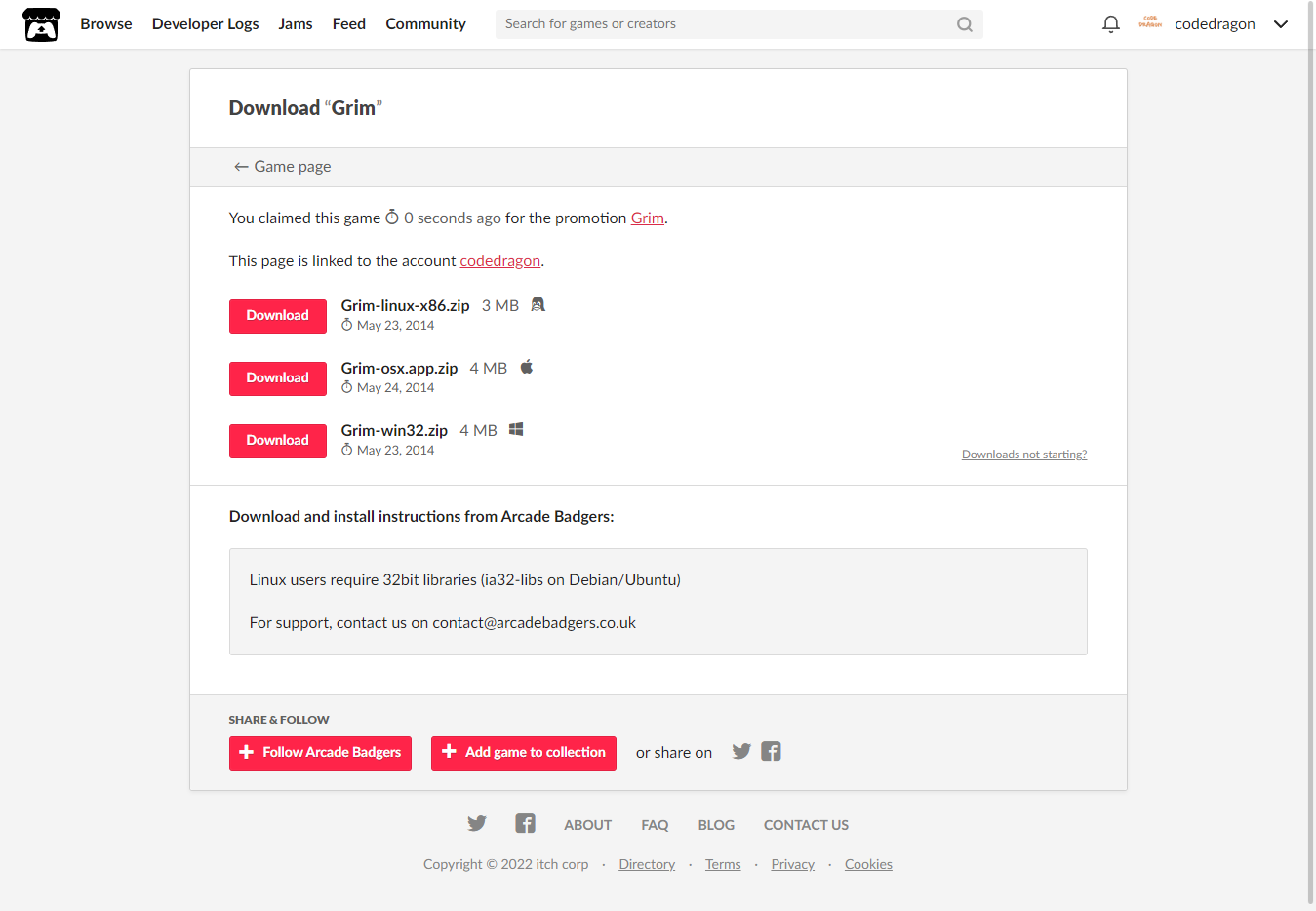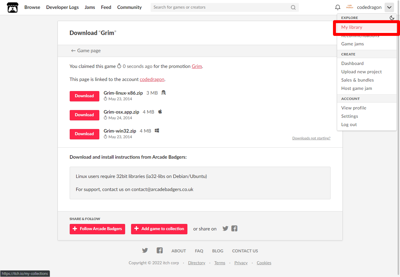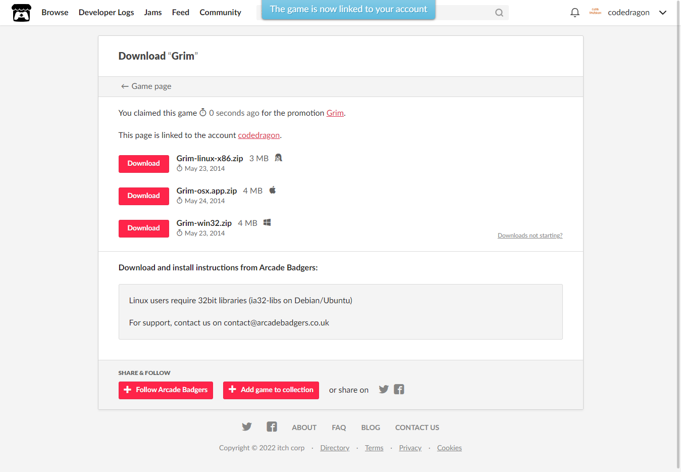 [Claim game]을 클릭하면 "Grim" 게임이 나의 게임 라이브러리에 추가되고 설치파일을 다운받을 수 있는 페이지로 이동됩니다.
