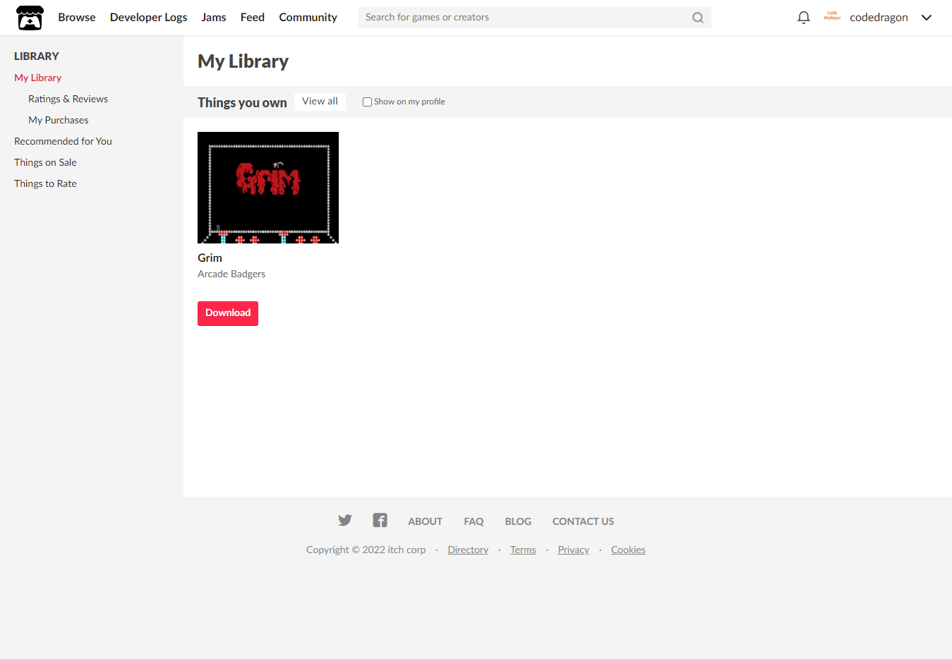 "My Lirary"에서 방금 받은 "Grim" 게임 항목을 확인할 수 있습니다.