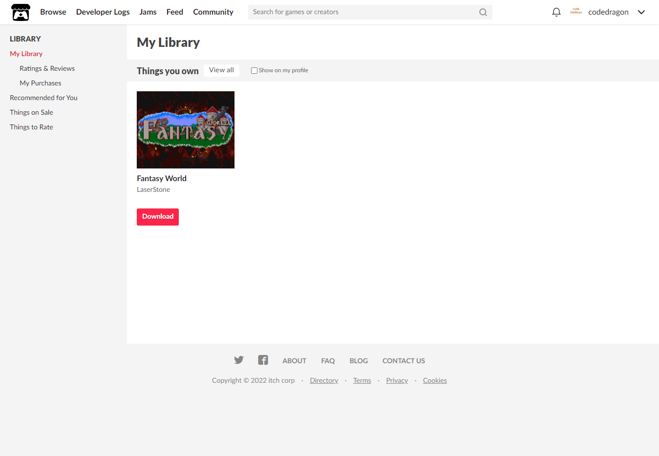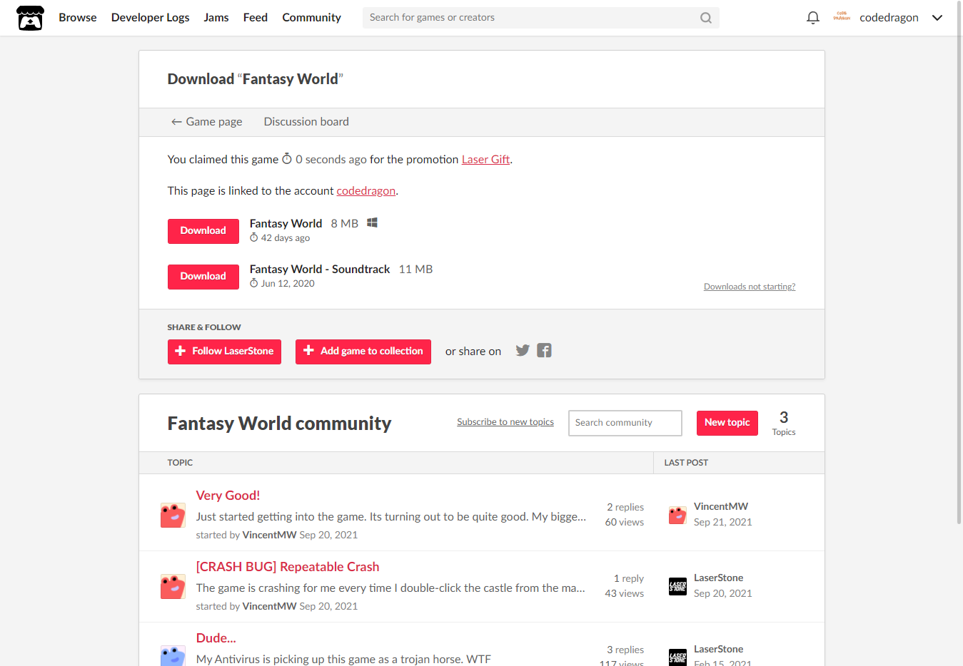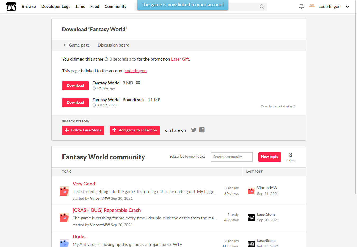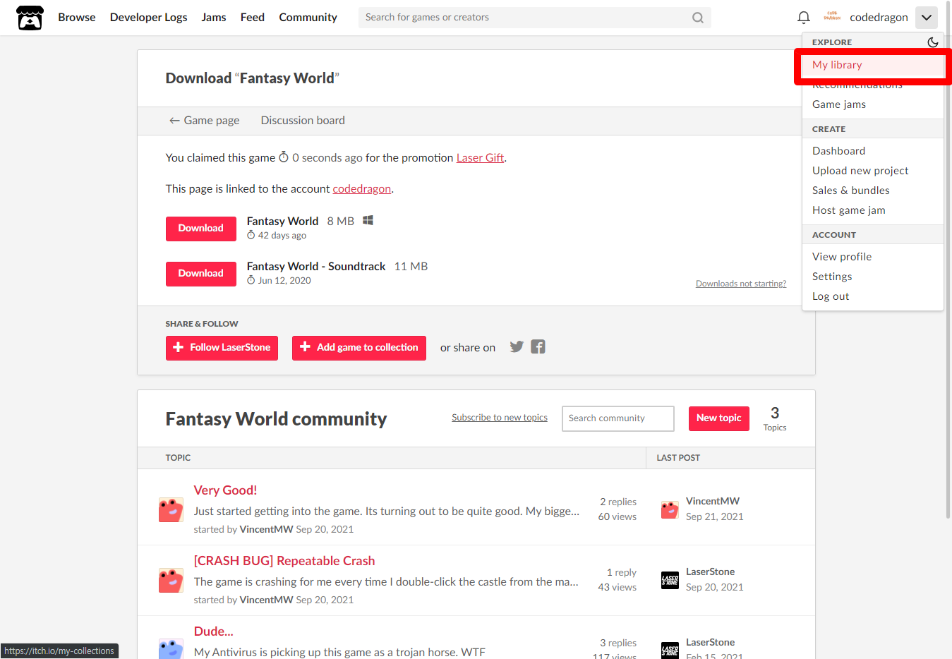 [Claim game]을 클릭하면 "Fantasy World" 게임이 나의 게임 라이브러리에 추가되고 설치파일을 다운받을 수 있는 페이지로 이동됩니다.