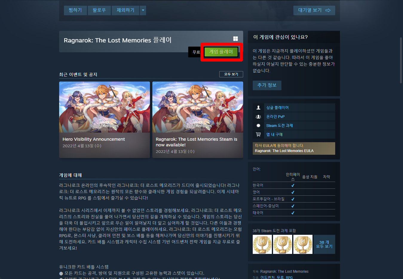 "Ragnarok: The Lost Memories" 페이지를 내려 [게임 플레이]를 클릭하면 됩니다.