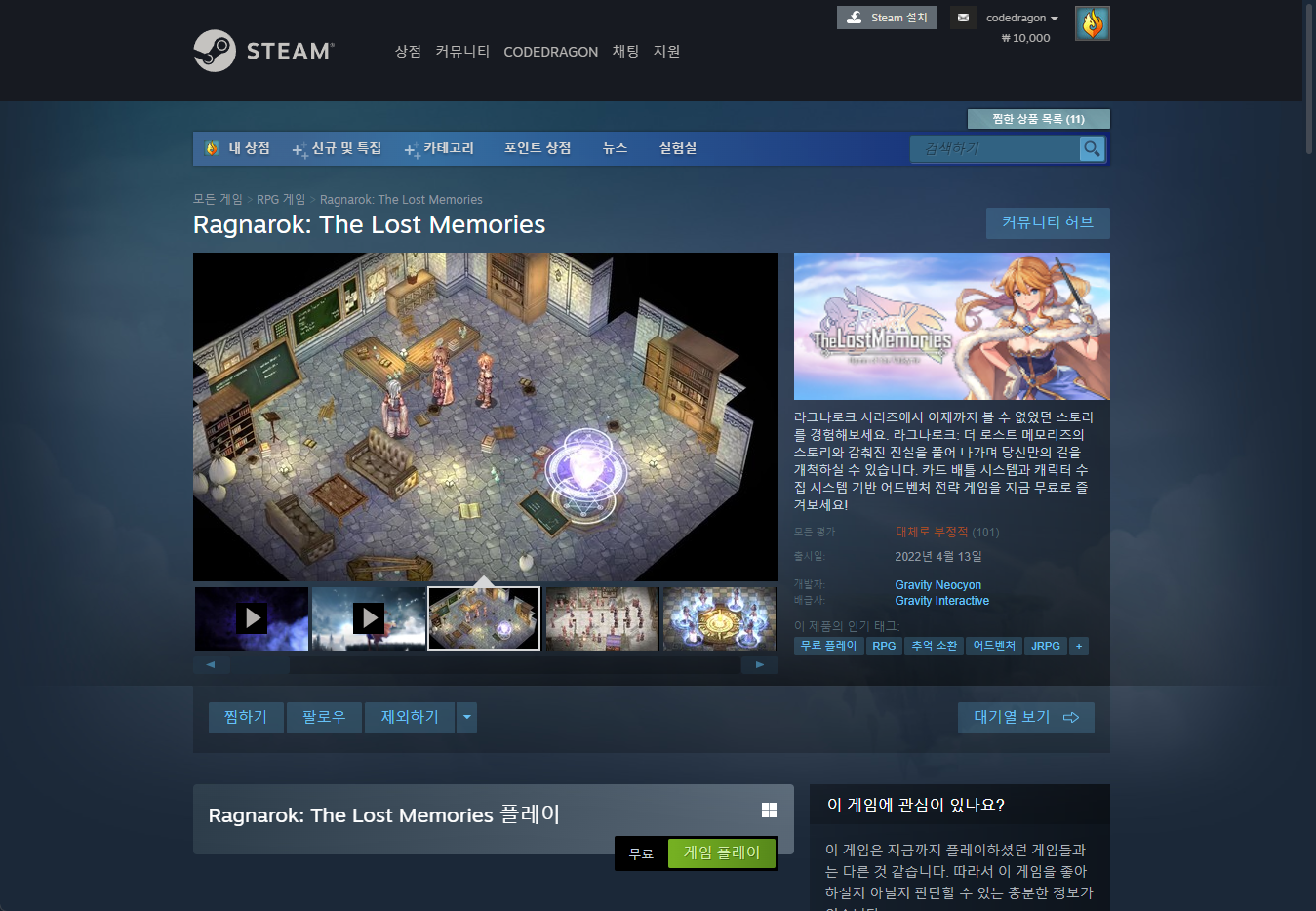 "Ragnarok: The Lost Memories" 스팀 페이지 입니다.