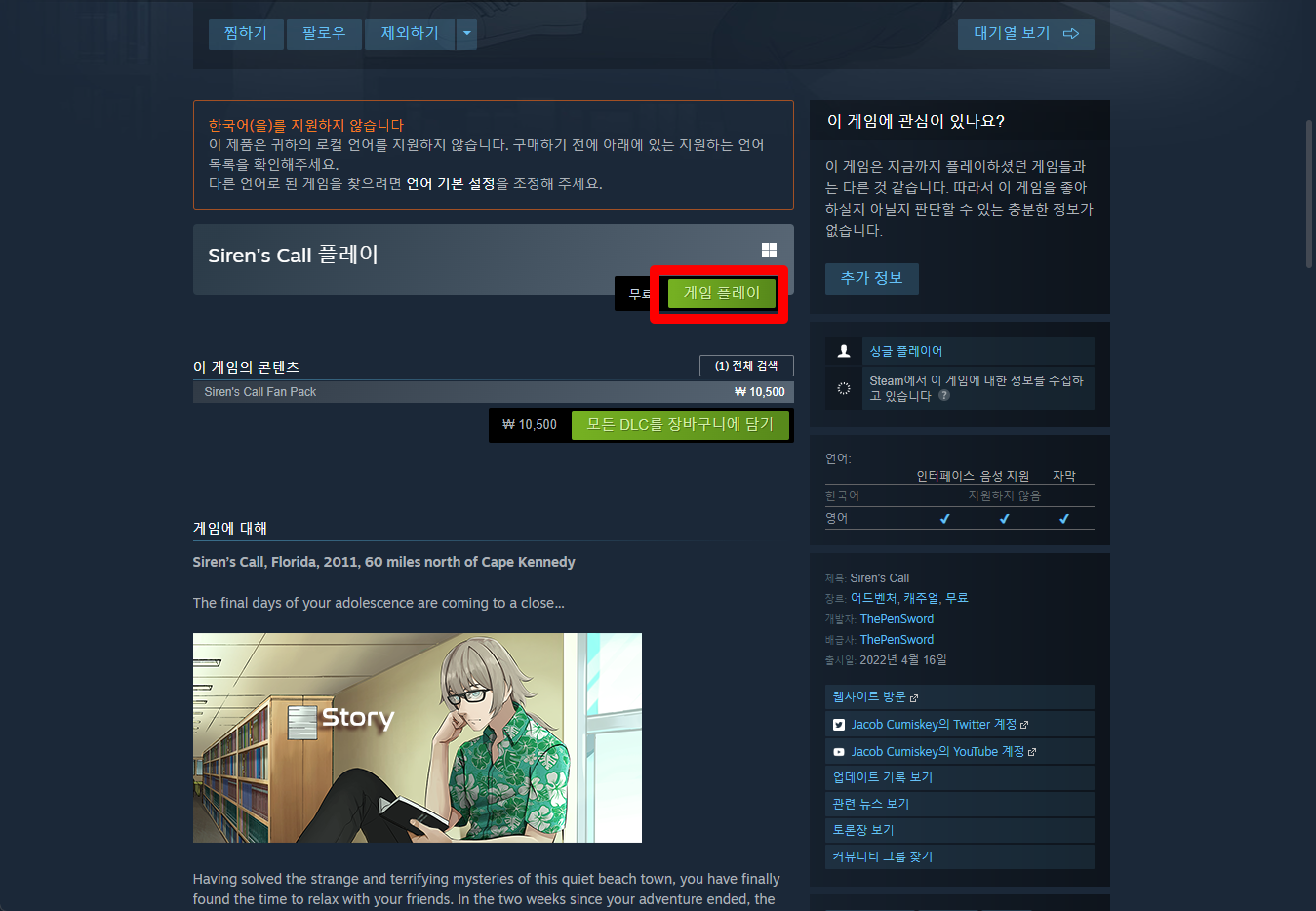 "Siren's Call" 페이지를 내려 [게임 플레이]를 클릭하면 됩니다.
