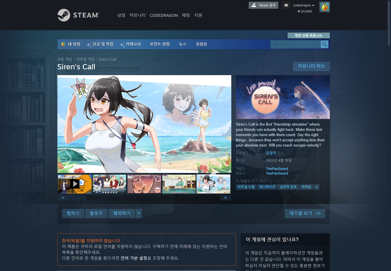 "Siren's Call" 스팀 페이지 입니다.
