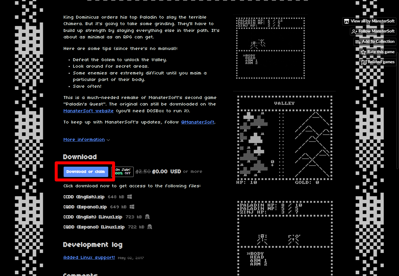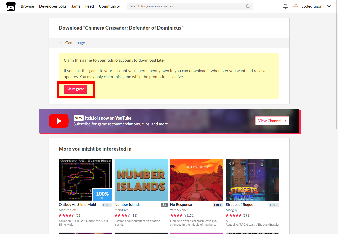 "Chimera Crusader: Defender of Dominicus" 페이지를 내려서[Download or claim]을 클릭합니다.