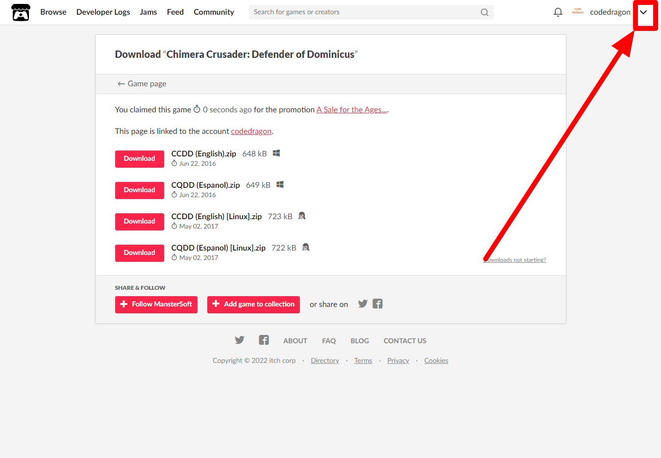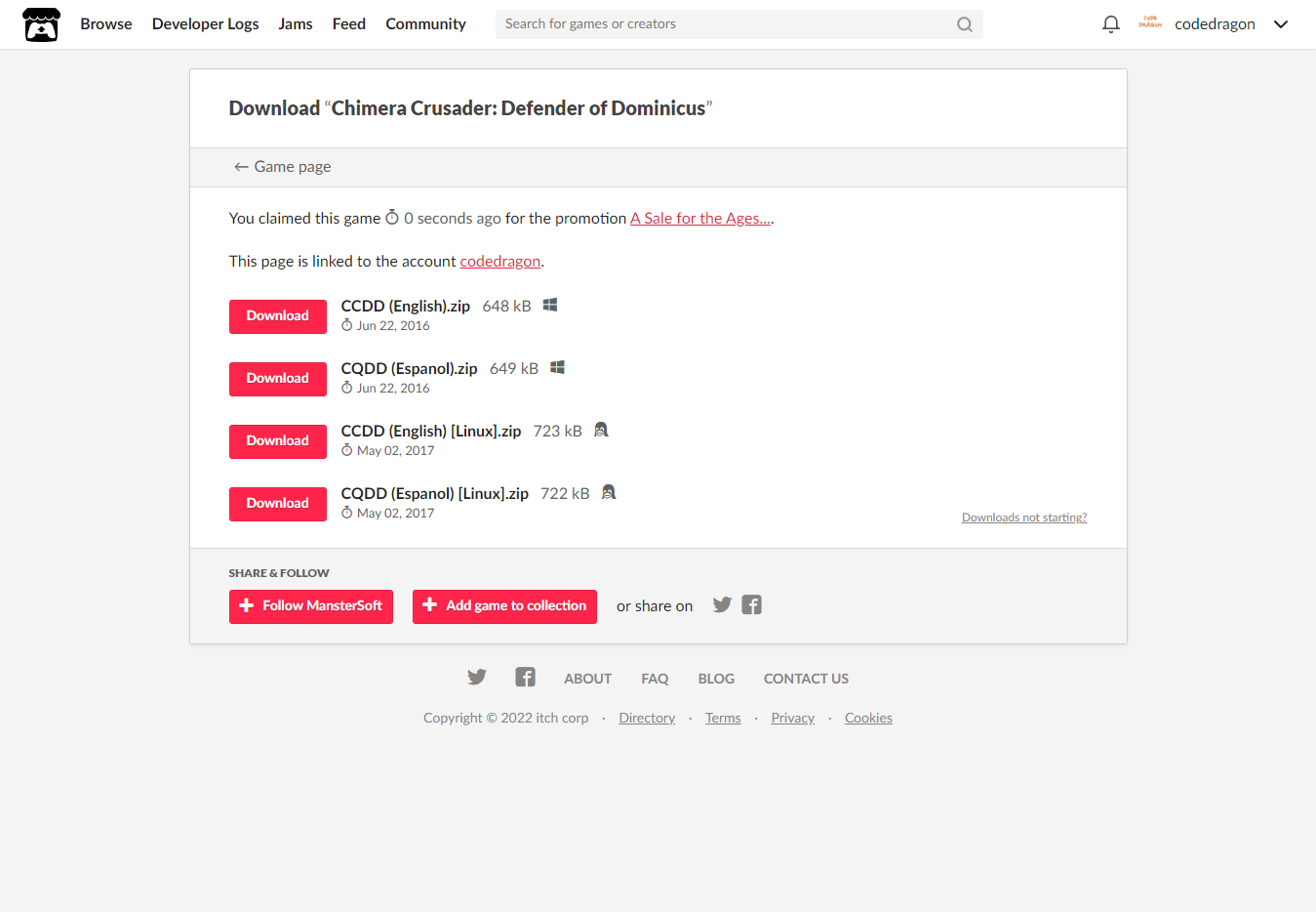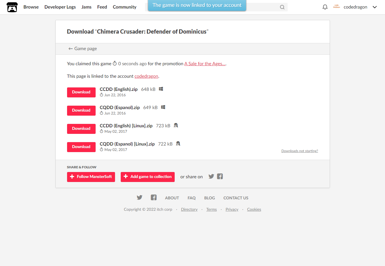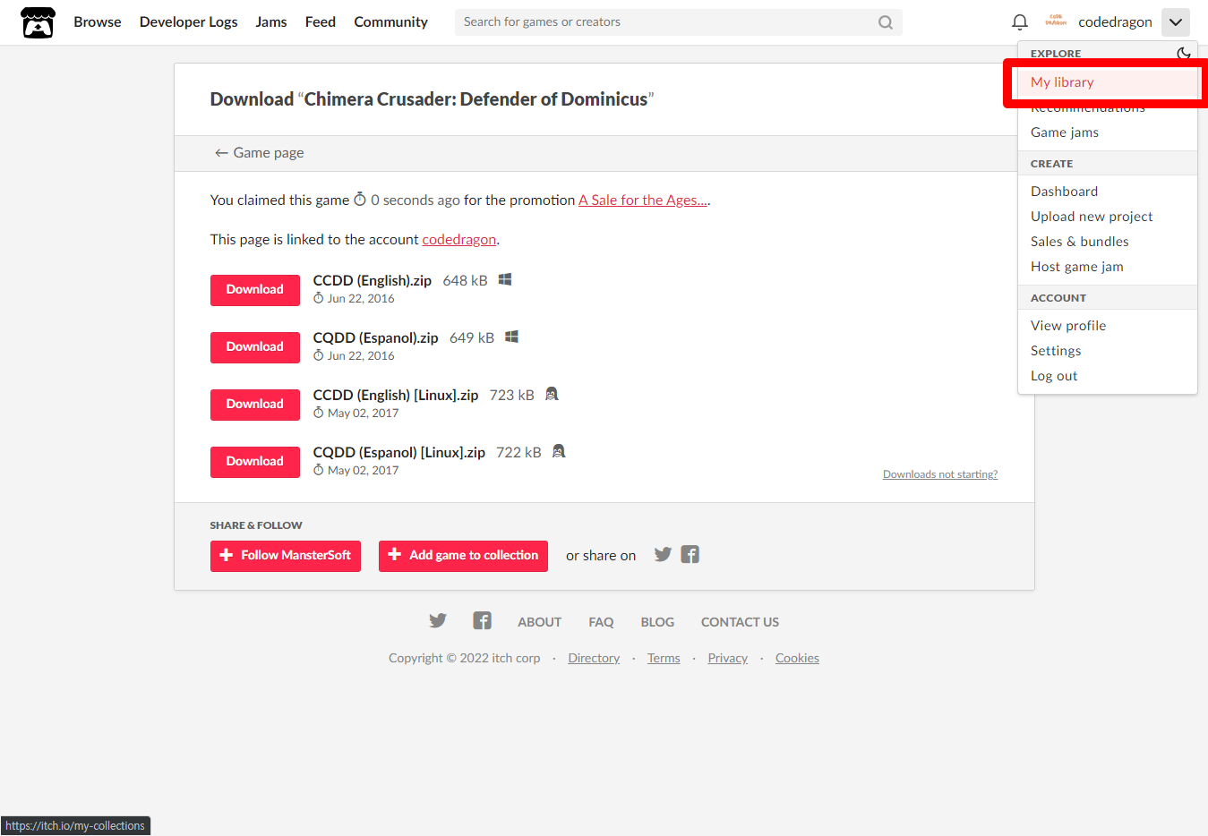 [Claim game]을 클릭하면 "Chimera Crusader: Defender of Dominicus" 게임이 나의 게임 라이브러리에 추가되고 설치파일을 다운받을 수 있는 페이지로 이동됩니다.
