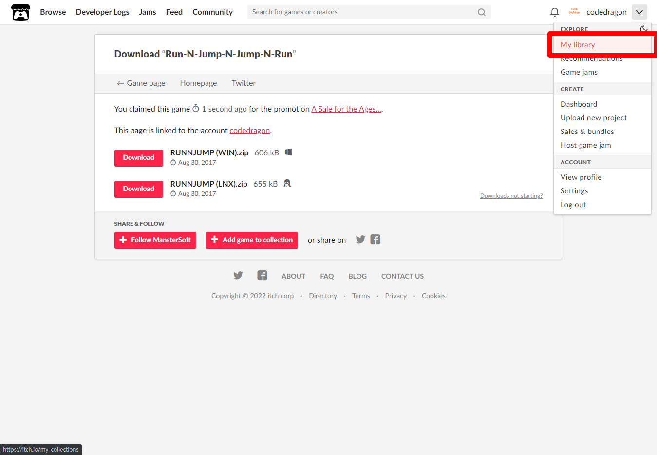 [Claim game]을 클릭하면 "Run-N-Jump-N-Jump-N-Run" 게임이 나의 게임 라이브러리에 추가되고 설치파일을 다운받을 수 있는 페이지로 이동됩니다.