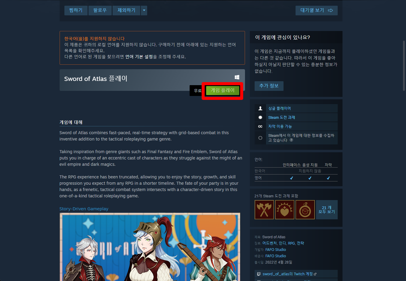 "Sword of Atlas" 페이지를 내려 [게임 플레이]를 클릭하면 됩니다.