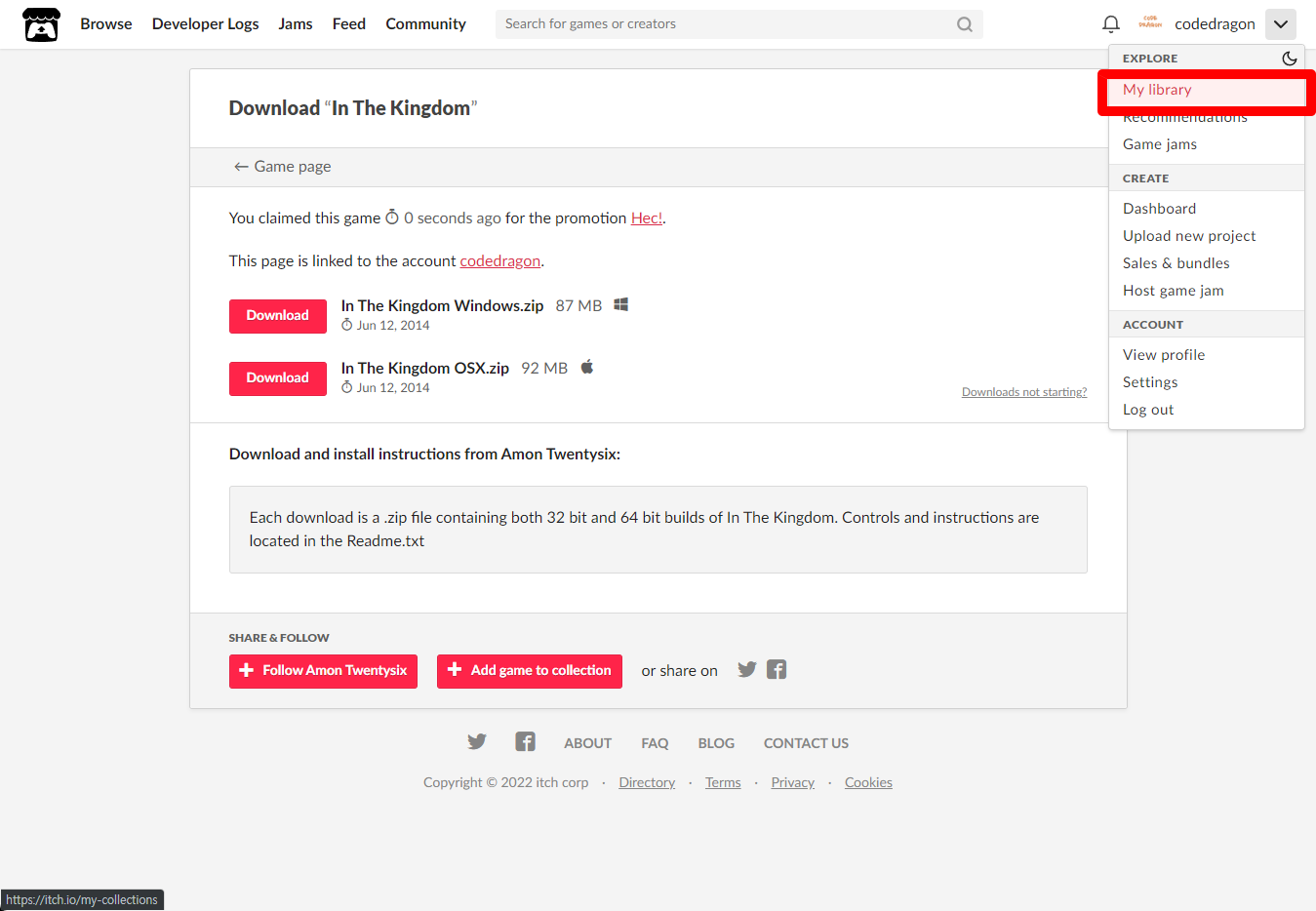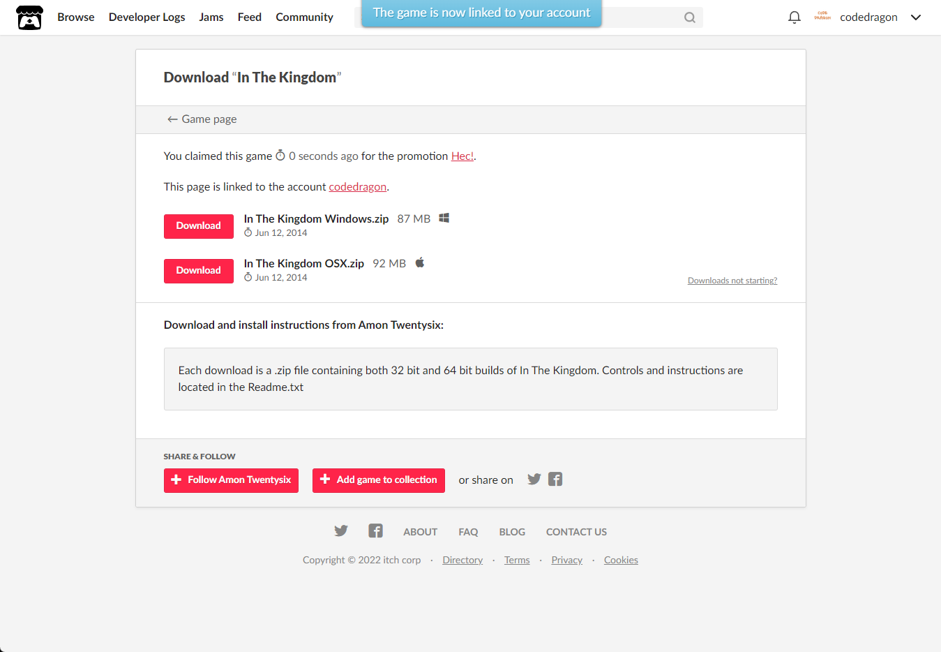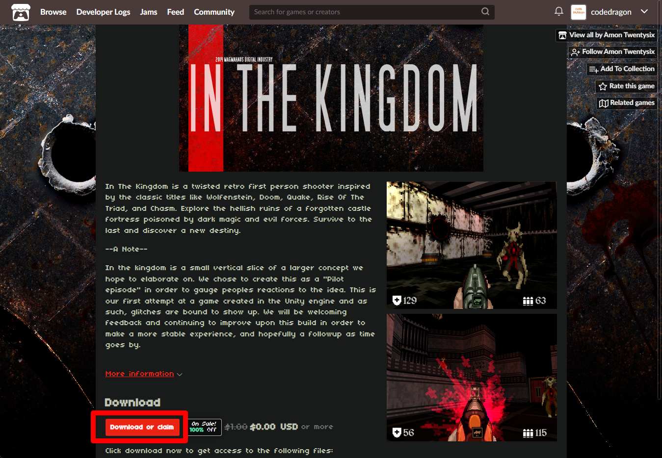 [Claim game]을 클릭하면 "In The Kingdom" 게임이 나의 게임 라이브러리에 추가되고 설치파일을 다운받을 수 있는 페이지로 이동됩니다.