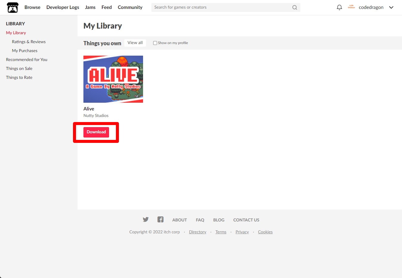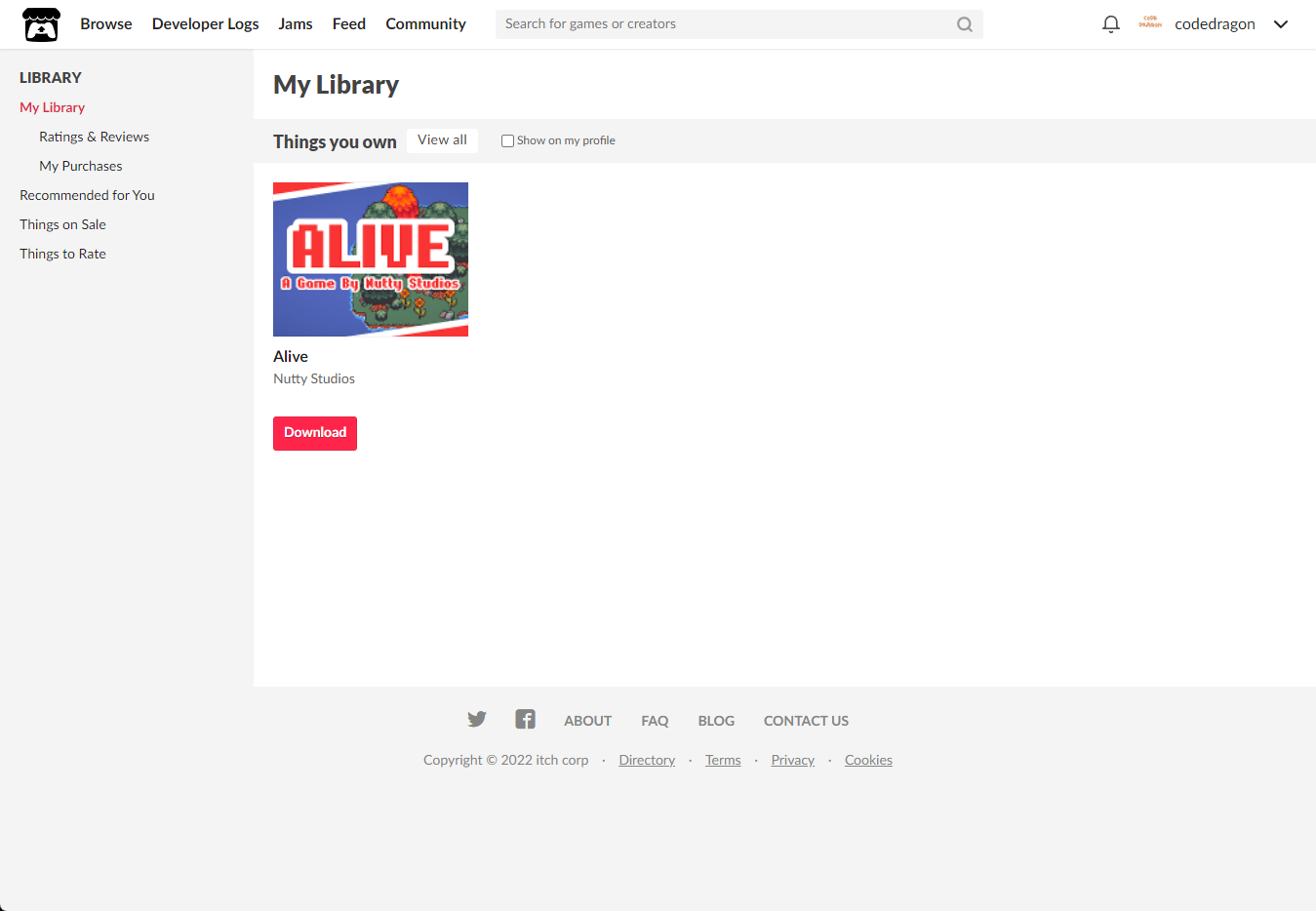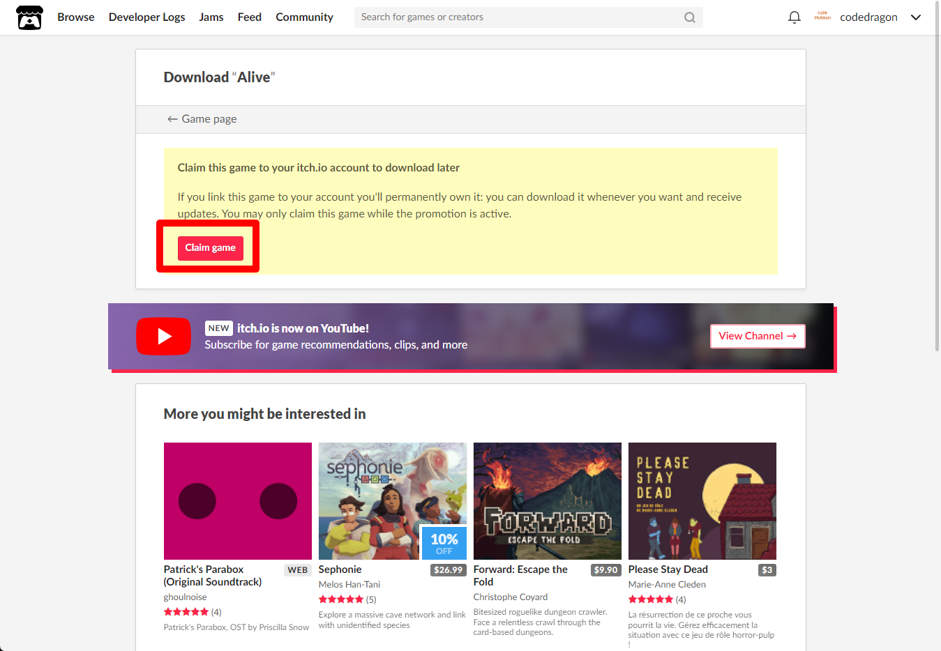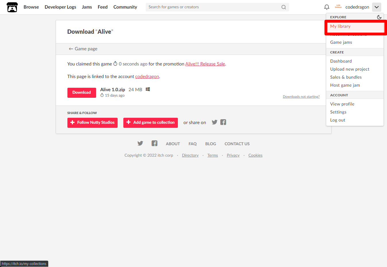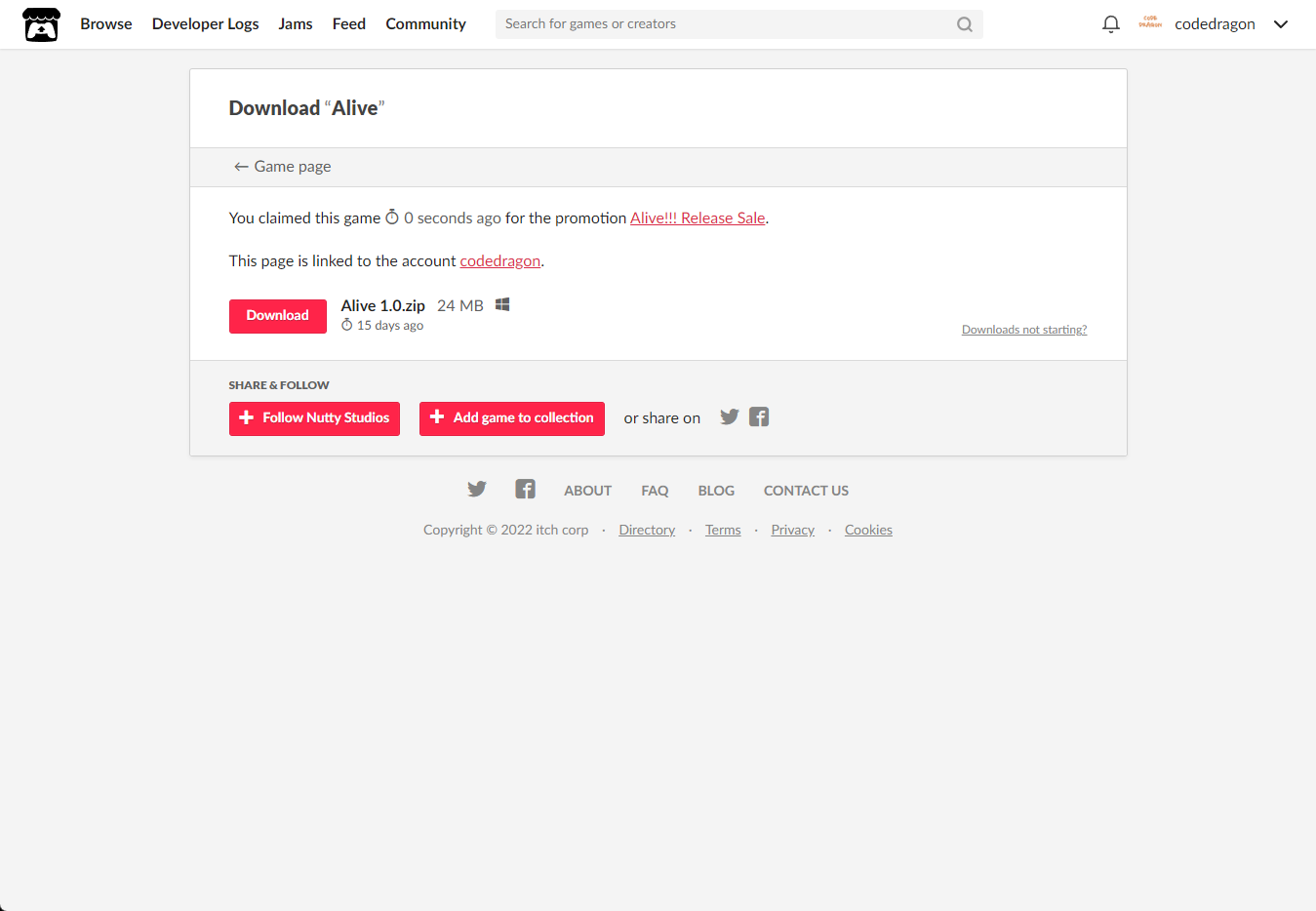 [Claim game]을 클릭하면 "Alive" 게임이 나의 게임 라이브러리에 추가되고 설치파일을 다운받을 수 있는 페이지로 이동됩니다.
