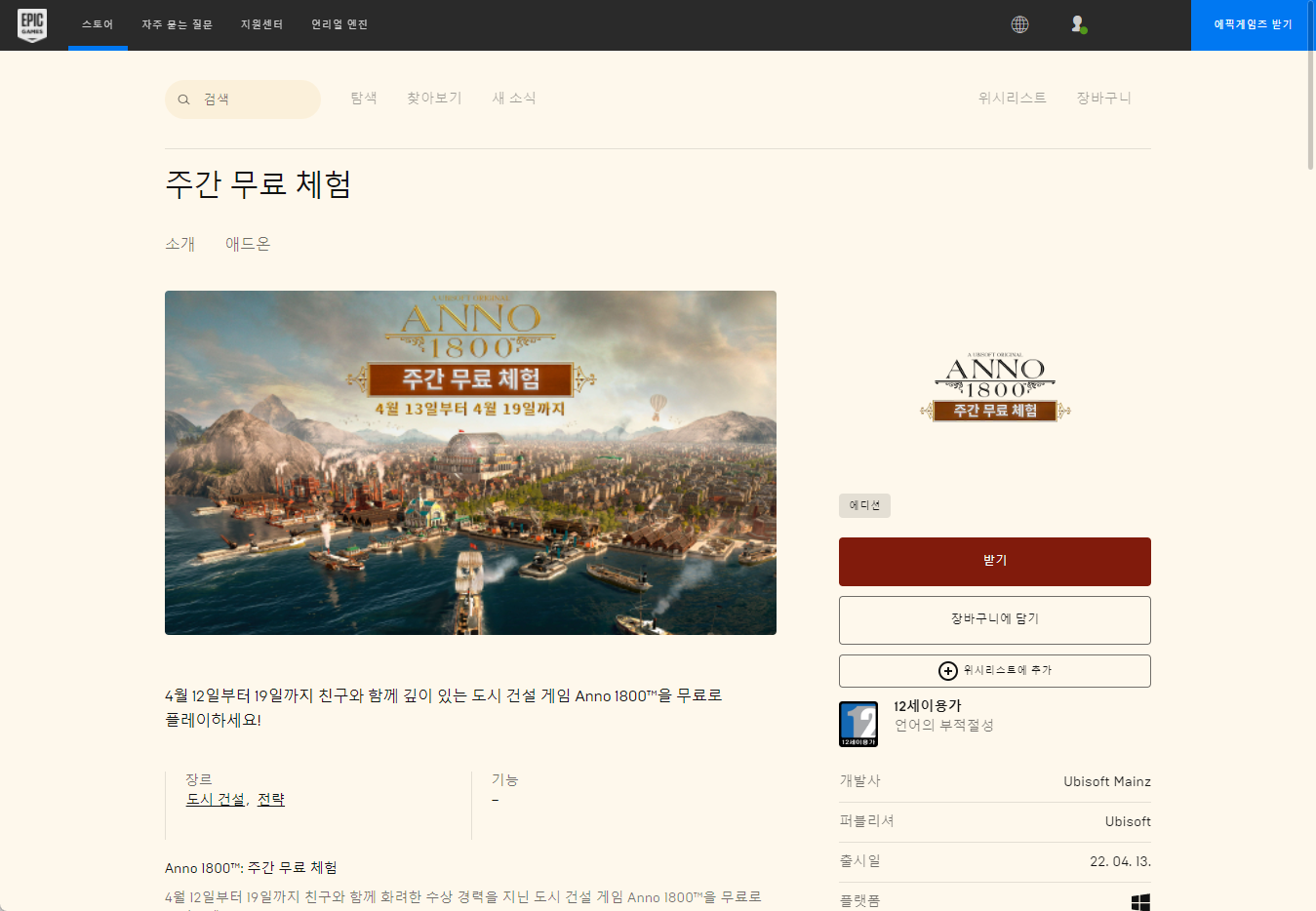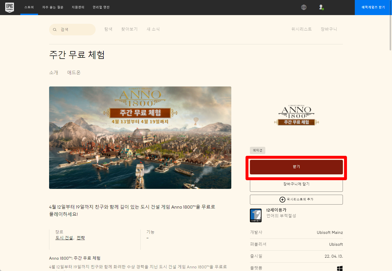 "Anno 1800 아노 1800" 게임페이지에서 [받기] 버튼을 클릭하면 됩니다.