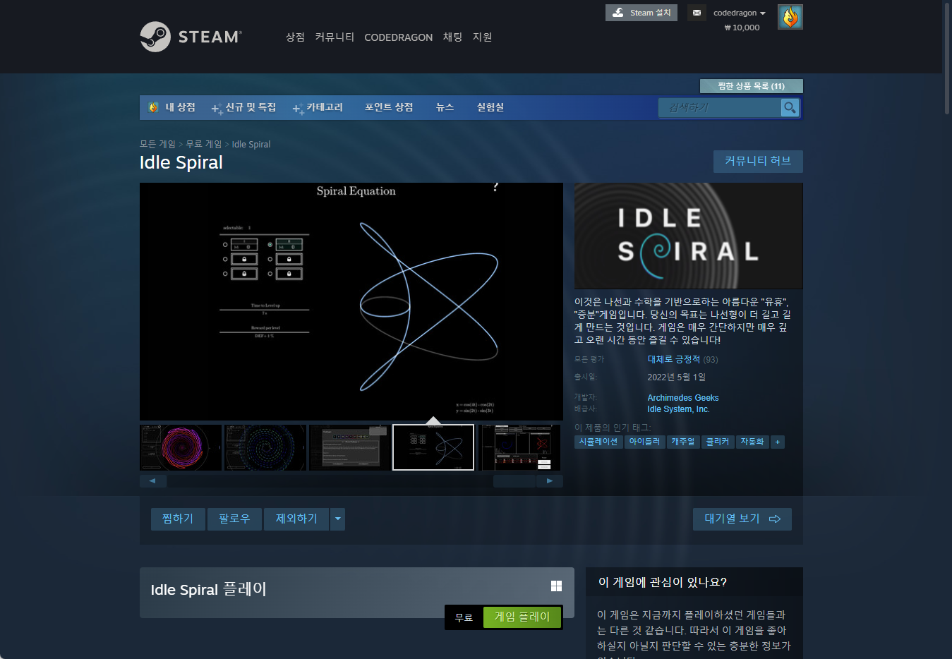"Idle Spiral" 스팀 페이지 입니다.