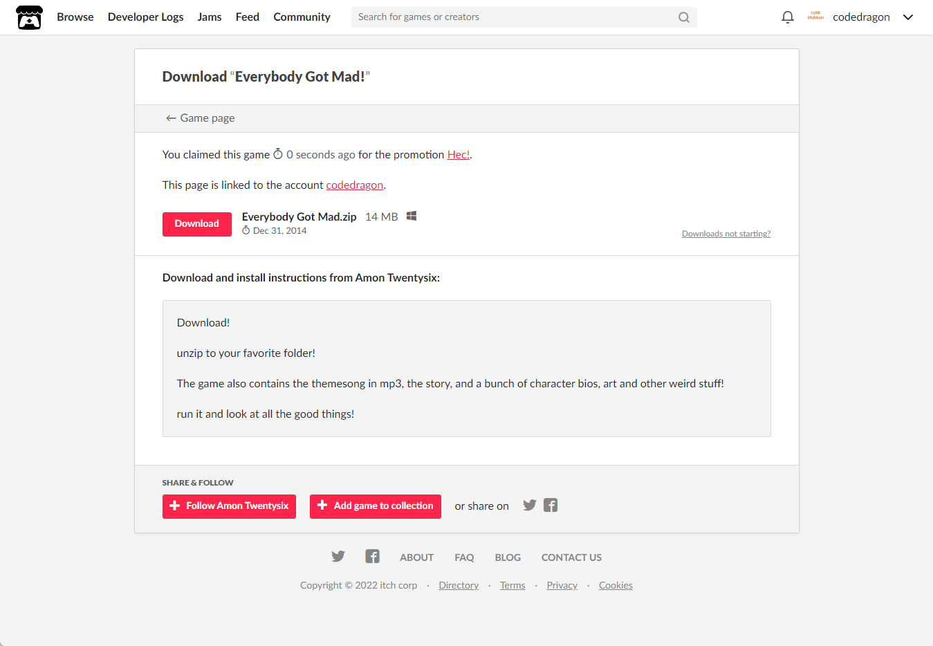 [Claim game]을 클릭하면 "Everybody Got Mad!" 게임이 나의 게임 라이브러리에 추가되고 설치파일을 다운받을 수 있는 페이지로 이동됩니다.